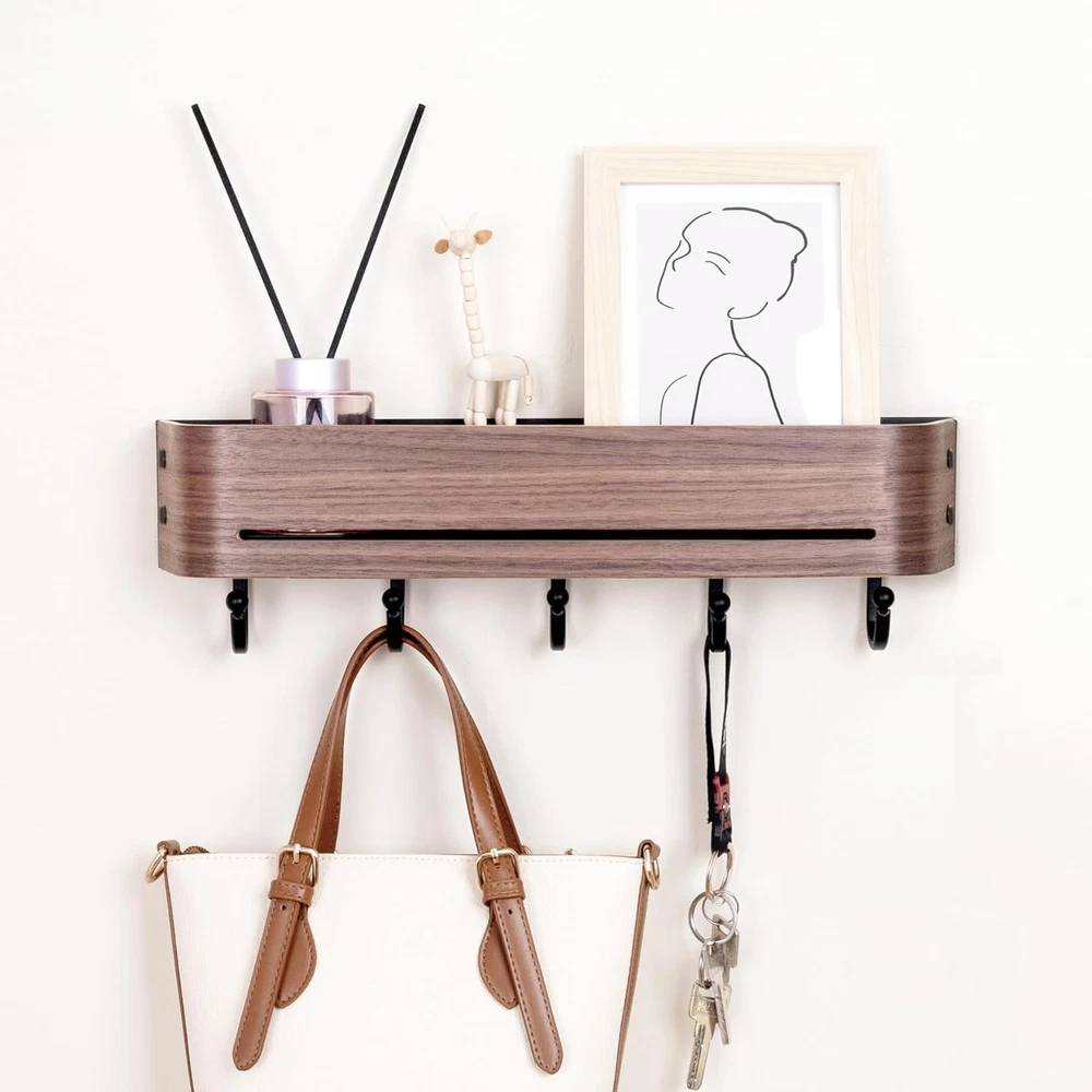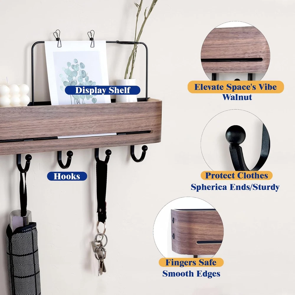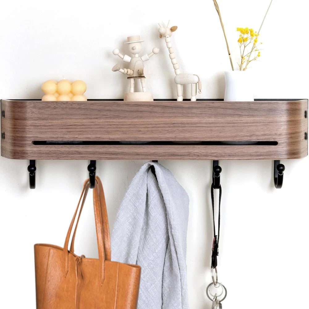 【Tidy and Organized】 Solve "entryway clutter" with this entryway wall organizer & coat rack wall mount;The top shelf can accommodates photo frames, purse, and envelope, while the lower section provides categorized storage for keys, umbrellas, towels, hats,etc. 【Family-Safe Design】 Arc design and spherical hook design to prevent injury;Groove design can effectively prevent items from slipping. 【Aesthetic Upgrade】 Curvilinear elegance meets walnut veneers, crafting an understated luxury entryway experience. 【Heavy-Duty Structure】 60-pound load-bearing guarantee (12 pounds per hook);Anti-bending flat hook;Anti-deformation curved surface panel. 【Effortless Installation】 80% less steps than traditional products. Product Description Say goodbye to chaotic mornings and welcome each day with tidiness! This wall hooks with shelf is designed to 「elevate your entryway」. It has all the practical functions of a regular hook, allowing you to hang various items with ease. Moreover, its 「natural wood grain」 adds a touch of warmth and elegance to your home.