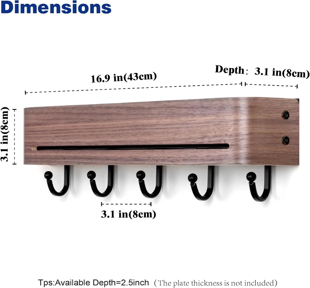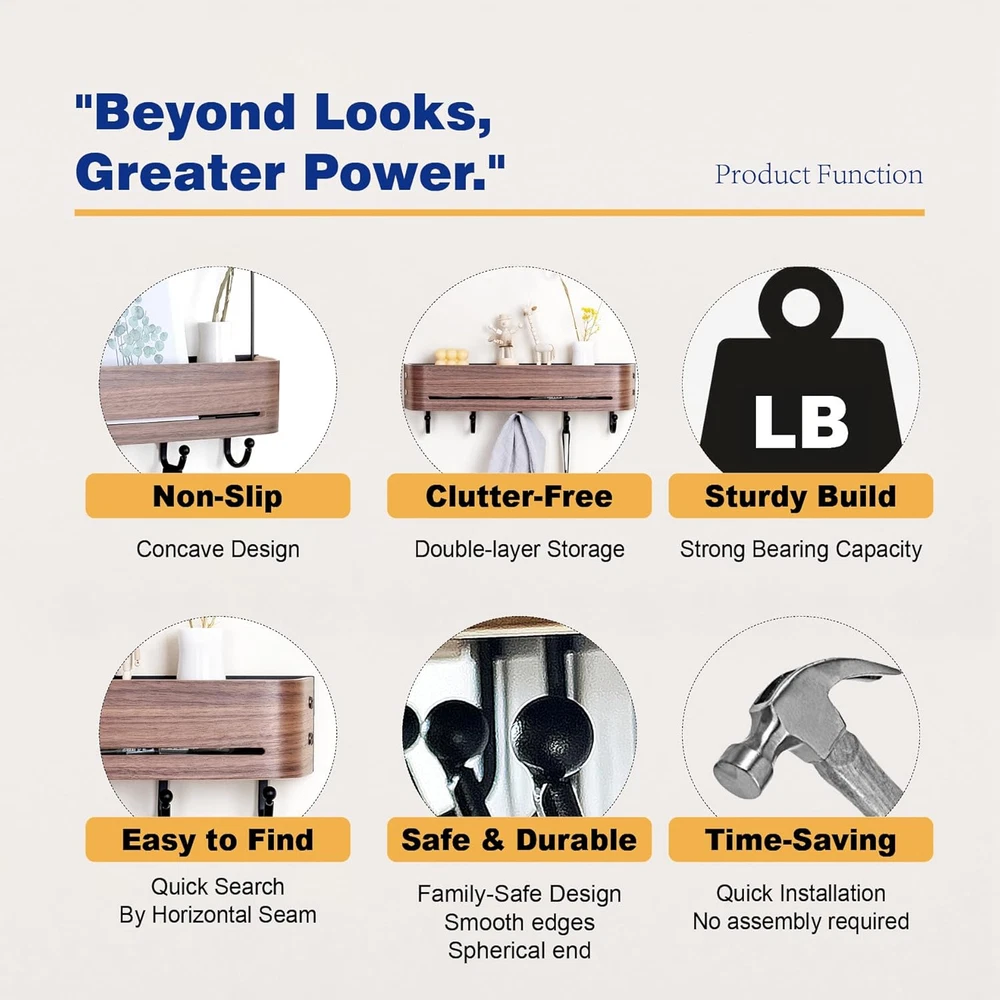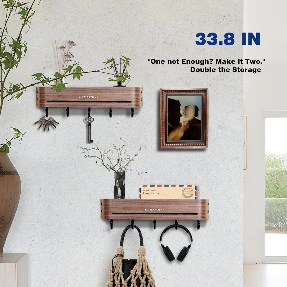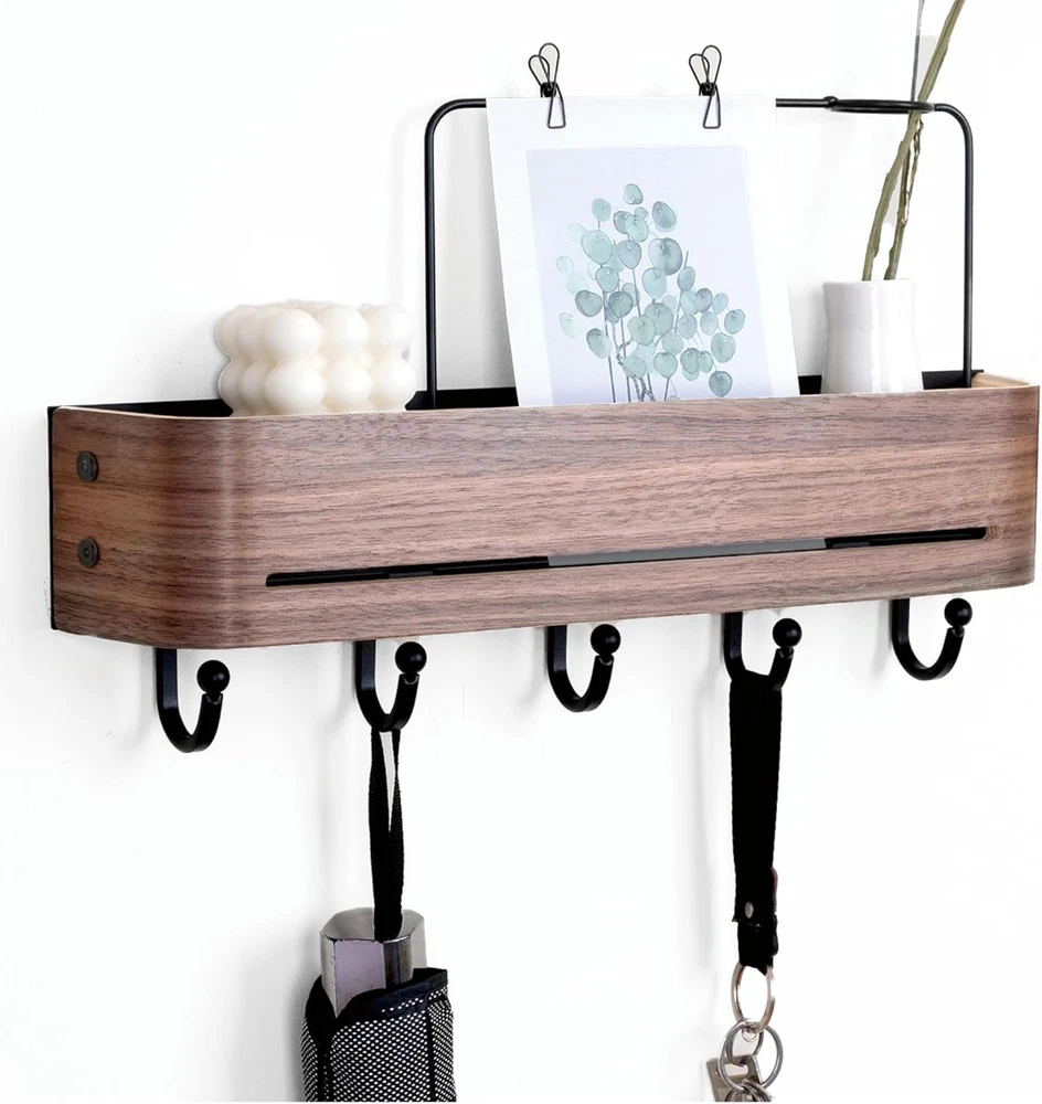 【Tidy and Organized】 Solve "entryway clutter" with this entryway wall organizer & coat rack wall mount;The top shelf can accommodates photo frames, purse, and envelope, while the lower section provides categorized storage for keys, umbrellas, towels, hats,etc. 【Family-Safe Design】 Arc design and spherical hook design to prevent injury;Groove design can effectively prevent items from slipping. 【Aesthetic Upgrade】 Curvilinear elegance meets walnut veneers, crafting an understated luxury entryway experience. 【Heavy-Duty Structure】 60-pound load-bearing guarantee (12 pounds per hook);Anti-bending flat hook;Anti-deformation curved surface panel. 【Effortless Installation】 80% less steps than traditional products. Product Description Say goodbye to chaotic mornings and welcome each day with tidiness! This wall hooks with shelf is designed to 「elevate your entryway」. It has all the practical functions of a regular hook, allowing you to hang various items with ease. Moreover, its 「natural wood grain」 adds a touch of warmth and elegance to your home.