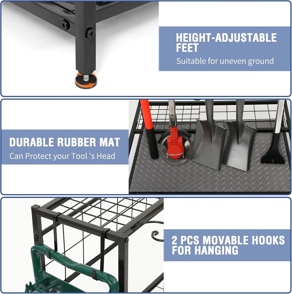 Garden Tool Organizer for Garage, Garden Tool Rack, Up to 58 Long Handled Tools, Yard Tool Holder for Garage, Shed, Outdoor, Tool Stand, Black (Garden Tool Rack) Item Description About this item ULTIMATE GARAGE, GARDEN TOOL ORGANIZER: Can hold up to more than 58 tools, including garden tools, farm tools, lawn tools, and also cleaning supplies, such as shovels, rakes, mops, Brooms and string trimmer etc. Make it easier to sort, organize and access the tools in garden, shed, garage, and backyard etc STRONG DURABLE STEEL CONSTRUCTION: This garage tool rack and shed organizer made of a durable coated steel frame that’s sturdy enough to withstand indoor or outdoor use. The garage organizer offers long-lasting strength and impressive performance, you will not worry about collapsing like plastic organizer INNOVATIVE GARAGE ORGANIZATION: G-hooks allows for electric tools like string trimmer and some tools with D-grip handle, height-adjustable feet suitable for uneven ground, durable rubber mat can protect your power garden tool 's head EASY TO ASSEMBLE: The tool storage rack can only take a few minutes to put together with the help of instruction, which included all hardware and tools needed DIMENSIONS: Overall product size: 28" L x 21.7"W x 28.4" H › See more product details It is a good helper that can hold up to more than 58 tools, including garden tools, farm tools, lawn tools, and also cleaning supplies, such as shovels, rakes, mops, Brooms and string trimmer etc. 2) SURPER STURDY AND STABLE STUCTURE & HEAVY DUTY STEEL MATERIAL You will impressed with it‘s storage capacity that can hold a ton of garden tools, and it can save space or stay organized in garden, garage, outdoor, storage shed. With 5 PCS G-Hooks, not only can hold the power tools such as string trimmer, but also the tools with D-Grip handle. Made of a durable coated steel frame, the tool tower offers long-lasting strength and impressive performance. It also stands up to the hot summer temps in garages with out melting like some other tool stands You no longer have to worry about the uneven ground and the trouble of shaking after placing your tools. the adjustable feet of garden tools rack make it always stable as a mountain. Payment We accept payment only through PAYPAL Shipping We ship products worldwide through standard express courier service, it will reach within 7 to 10 days to abroad buyers, we ship the product after recieved clear payment and give full information about shipment to the buyer Return We accept product return within 7 to 21 days from delivery date but product should be in original position and not in damaged condition,the return shipping charges will be buyer responsibility