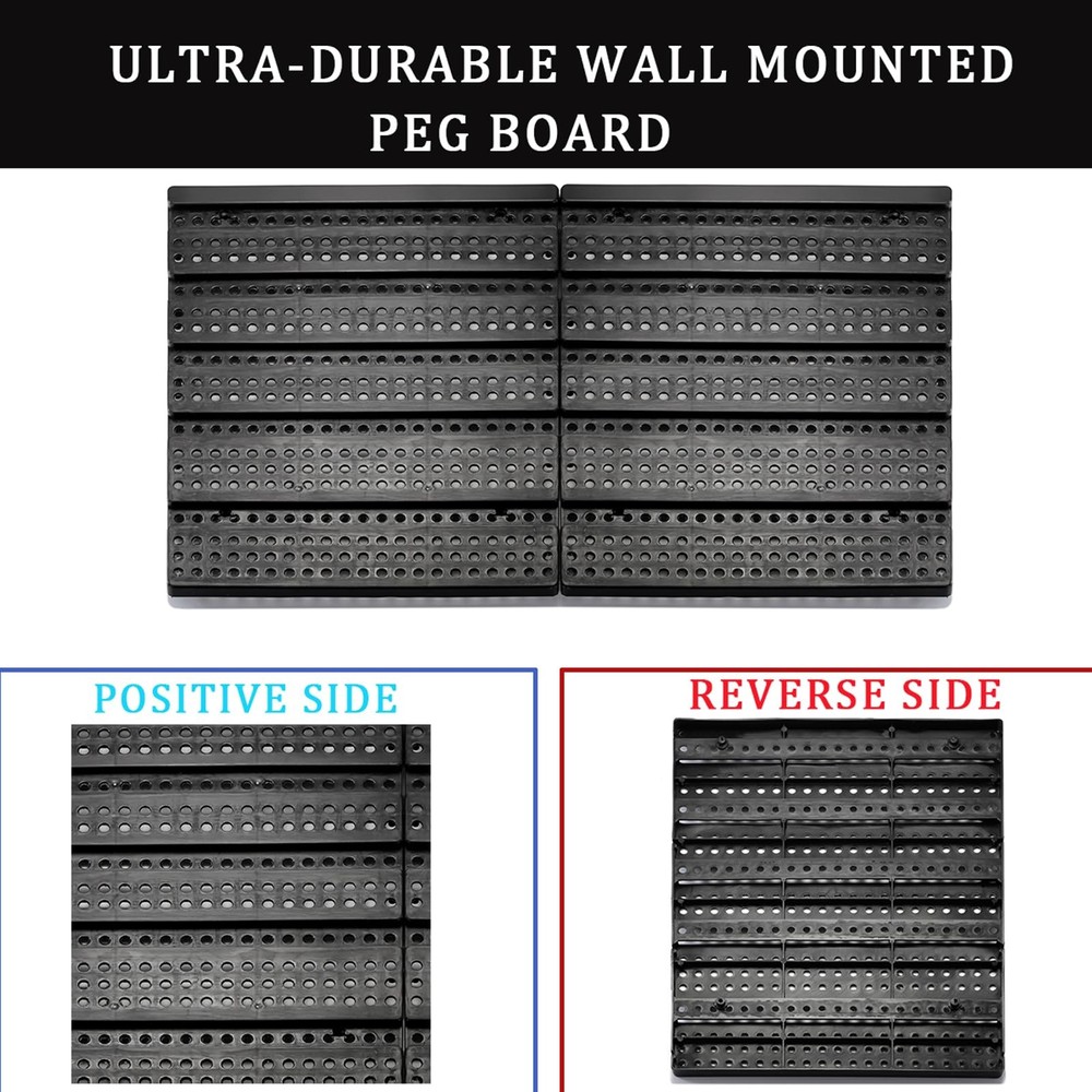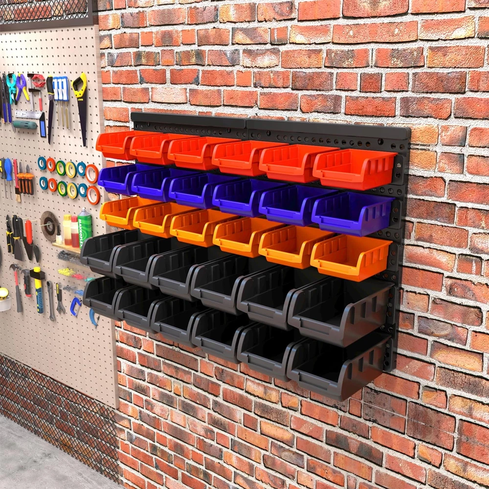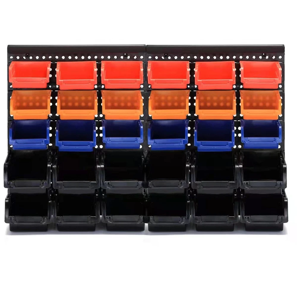 Size of the Rack and bins: Overall Dimensions: 25.2" X 16" X 7", 2 PCS Black Panel Board: 12.6”x 16.2”, 6 PCS Small Red Bins: 4.3”x 3.5”x 1.9”, 6 PCS Small Orange Bins: 4.3”x 3.5”x 1.9”, 6 PCS Small Blue Bins: 4.3”x 3.5”x 1.9” 12 Large Black Bins: 6.3”x 4.1”x 2.9” Size of the Rack and bins: Overall Dimensions: 25.2" X 16" X 7", 2 PCS Black Panel Board: 12.6”x 16.2”, 6 PCS Small Red Bins: 4.3”x 3.5”x 1.9”, 6 PCS Small Orange Bins: 4.3”x 3.5”x 1.9”, 6 PCS Small Blue Bins: 4.3”x 3.5”x 1.9” 12 Large Black Bins: 6.3”x 4.1”x 2.9” Easy Distinguish: 4 colors of the bins would be helpful to distinguish the different kinds of tools. The lid free design would show the contents directly Strong Material: These Garage storage bins are made of completely new PP with strong and durable features Wall mounted storage bins: This wall mounted storage bins could greatly save the space. It could be use of garage hardware organizer to contain bolts, screws, nuts, hand tools and so on DIY Combination: The hardware storage bins could be assemble as you like. Two back boards could be separately installed on the wall. Moreover, they can be linked to be one bigger one by using “H” shape links
