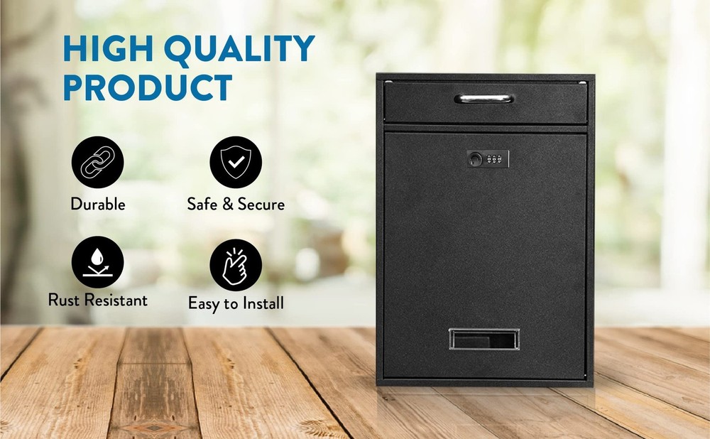 Wall Mounted Locking Vertical Dropbox Mailbox - Safe and Secure (Large) | Made with Galvanized Steel (Black Combination Lock) Product Details Color: Black Combination Lock Brand: Yulli MPN: CO1 UPC: 852130008216 EAN: 0852130008216 Material: Alloy Steel Color: Black Combination Lock Included Security Features: Lockable Brand: Yulli Mounting Type: Wall Mount Material: Alloy Steel Color: Black Combination Lock Included Security Features: Lockable Brand: Yulli Mounting Type: Wall Mount Product Dimensions: 4.75"D x 11"W x 16"H Style: Classic Item Weight: 2.27 Kilograms Access Location: Front UPC: 852130008216 Manufacturer: Yulife, LLC Item Weight: 4.99 pounds Country of Origin: China Item model number: CO1 Is Discontinued By Manufacturer: No Batteries required: No Included Components: mounting_hardware Heavy-Duty Construction: Built with 24-gauge galvanized steel for durability and weather resistance Secure Locking Mechanism: Equipped with a combination lock to prevent unauthorized access Space-Saving Design: Measures 4.75"D x 11"W x 10"H to fit perfectly on walls Large Mail Capacity: Narrow opening allows for larger mail and magazines Easy Wall Mount Installation: Mounting type is wall mount, making it convenient to install Identity (ID) theft is a crime where a thief steals your personal information, such as your full name or social security number, to commit fraud. The identity thief can use your information to fraudulently apply for credit, file taxes, or get medical services. These acts can damage your credit status, and cost you time and money to restore your good name. You may not know that you are the victim of ID theft until you experience a financial consequence (mystery bills, credit collections, denied loans) down the road from actions that the thief has taken with your stolen identity. The Federal Trade Commission estimates 400,000 Americans have had their mail and their identities stolen. It is important to take preventative measures to NOT have your identity stolen so you will not have your credit destroyed. Identity theft takes many years to undo and rectify. This mailbox is made with 24 gauge galvanized sheet metal with a powdered finish to resist corrosion from weather. In addition to the strong construction, the design of the mailbox prevents theft by prohibiting hands from reaching inside. The narrow opening still allows for larger mail and magazines so the mailbox is very convenient and practical. Caution: While this mailbox will deter common thefts, this mailbox is not intended to store valuables. Warning: It is important to note that it is not the responsibility of mail carriers to open mailboxes that are locked, accept keys for this purpose, or lock mailboxes after delivery of mail.
