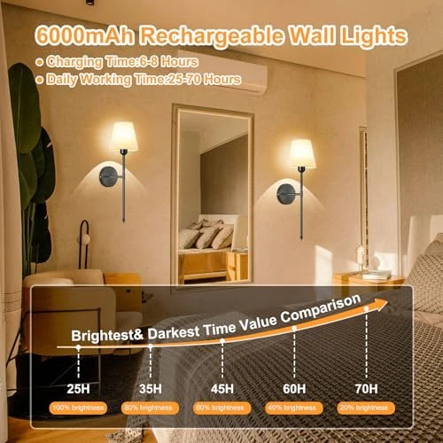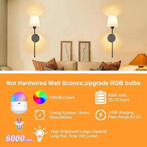 【Battery Operated Wall Sconces】 Wall sconces set of two battery operated comes with two 300 lumen, 6000 mAh E26 rechargeable bulbs. Wall sconce bulb Use Android USB charging cable to charge(Including charging cable), 6000mAh battery for lighting time reaches 25-70 hours (No wiring install) 【RGB Wall Scones】Our Battery powered wall scones let you customize your lighting like a painter with their palette. Each wall sconce offers 7 RGB colors and dynamic modes, as well as 3 color temperatures to choose from,you can choose your favorite colors for different occasions and moods. Rechargeable, includes USB charging cable (Type-C) 【Wireless Remote Control and Battery Run】Battery-operated Wall sconce remote control dimmable brightness (10%-100) and color temperature (2700K-6500K) 【Easy to Install】Wireless Wall Sconce, Indoor battery operated wall lights require no wiring and electrician, includes all mounting hardware for quick and easy installation of battery wall sconce, Battery wall light fixture with bulb and remote control included. These sconces are invaluable for power outages 【Wide Applications】Modern style and simple design of the battery operated wall light fixtures create a comfortable and warm atmosphere, these wireless wall lights perfect for bedroom reading lights and seamlessly fit into your living room, office, vanity, or even dark areas like hallways, closets, and corridors
