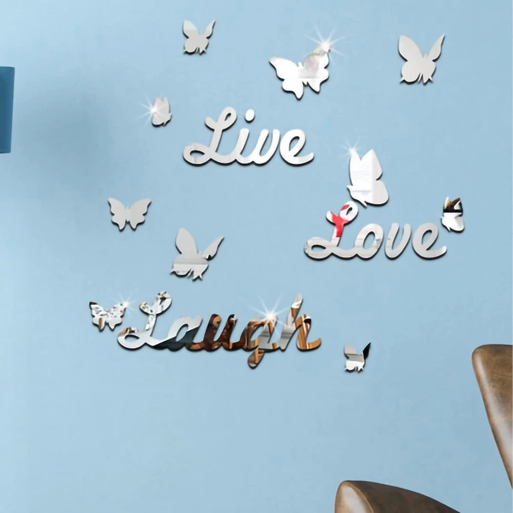 Product Description About this item √ 【Durable Material】- Live Love Laugh letters and Butterfly shaped mirror wall stickers use high-quality acrylic mirror materials, environmentally friendly, durable, easy to clean, crystal texture, clear images. The back of sticker has glue and the surface has a protective film on it. It is easy to paste and easily removable without damaging wall. √ 【Live Love Laugh Design】- Modern art mirror decorative wall stickers make your home brighter, circular patterns and home letters add warmth, affection and love atmosphere. √ 【Wide Range of Uses】- please stick the sticker on a smooth and flat wall without leaving a gap to prevent it from falling off. Suitable for TV background wall, living room, bedroom, children's playroom, dining room, etc. It is a great decoration for any special occasions such as weddings, birthdays, anniversaries, engagements, graduations, etc. √ 【Creative DIY Gift 】- The set contains the word HOME LOVE and 18 round mirror stickers. You can DIY these acrylic mirror wall stickers in different ways according to your own preferences. Let the warm atmosphere surround your family. Can be used as housewarming or anniversary gifts, can also be used to decorate birthday parties and weddings. DIY mirror butterfly stickers silver love live laugh butterfly wall letters butterfly 3d mirror wall stickers home decoration decal DIY stickers: There are 23 pieces stickers in total, each sticker is divided, so people can make random arrangement according to their needs, without much spatial and furniture requirement. Self-adhesive: 3D mirror decals are easily pasted on even walls, there is no need for other tools while in pasting, because they are in self-adhesive design, convenient for people to use. Decorative function: The combination of silver butterflies and words decals can greatly attract people's attention and make your room look different, stickers suit to smooth and clean places like living room, playroom, dining room, kitchen, office, hallway, classroom and other places. Specification: Material: plastic Color: silver Quantity: 23 pieces (letter "i" contains 2 pieces) Size: as shown in picture Package includes: 9 x Mirror butterfly 14 x Mirror letter Warm notice: Due to manual measurement, there might have slight differences on size. The protective film on the mirror surface is to prevent the mirror from being scratched, if you want stickers have a good look, please peel films off after sticker being pasted. The words painted on the product are not as trademarks, our trademark is Outus.