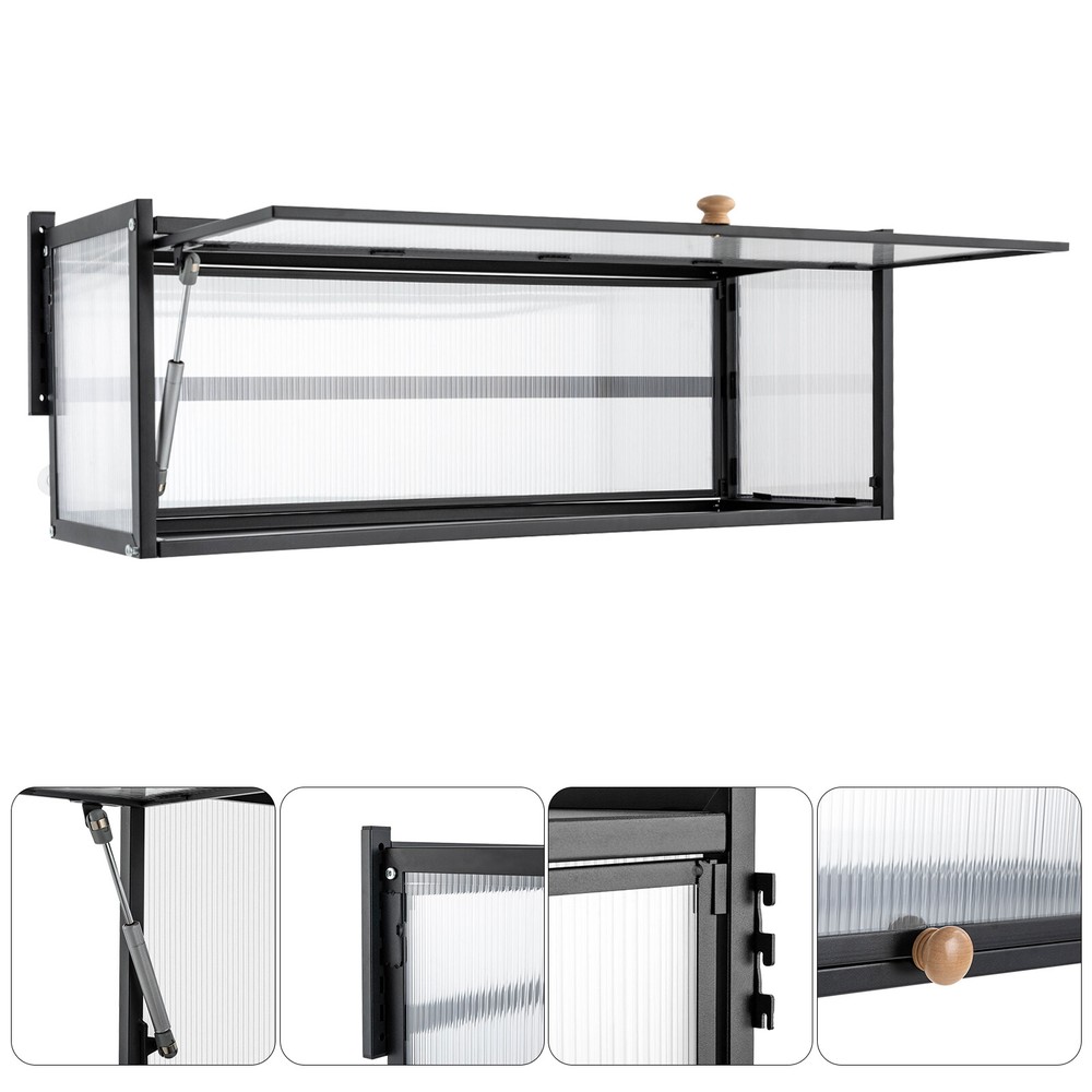 Key Features High-quality Selection: The high-quality carbon steel and polycarbonate hollow panels, combined with coating technology, make this product resistant to rust and scratches, suitable for long-term use. Wall-mount Design : The wall cabinet can make full use of wall space, especially suitable for small rooms and can be integrated with various occasions. You can install it at a suitable height for quick access to your items. Worry-free Installation : The equipped suction cups, auxiliary stickers, detailed Chinese& English instructions, and glues, ensure a stable installation without damaging the wall. Flip-up Design : The hydraulic support rod allows the opening and closing angle to reach 90 °, making it easier to take items, achieving silent closing and reducing the risk of hitting heads. Maximize Your Storage : Large capacity allows easy storage of kitchen spices, and the flat top can also be used to store items to save space. High Load-bearing Capacity: This cabinet not only looks good but also has a big load-bearing capacity of about 55lbs, so you can place items as you like without worrying about them collapsing. Beautiful Appearance: The unique textured cabinet door plus the wooden handle demonstrate a unique texture. Meanwhile, the semi-transparent visual effect presents a hazy aesthetic of storage. Easy to Clean : The cabinet door can play a dustproof and antifouling role while the smooth surface of the product also enables easy and fast cleaning, and you only need to wipe away the stains with a towel. Specification Material: Carbon Steel, Polycarbonate Hollow Sheet, Wood Surface Treatment: Painting Color: Black, Translucent Special Feature: Flip-up Load Capacity: 25kg/55lbs Product Size: 85*28*30cm/33.5*11*11.8in Details Solid Back Plate : Enlarged and thickened back plate provides stronger support, so you can use this item with peace of mind. Rounded Edges : The edges of this product have been polished smooth to avoid damage caused by bumping, making it safe and comfortable. Application This wall cabinet is an all-around item and is suitable for the kitchen, living room, office, etc. Package Included 1x Wall-mounted Cabinet 1x Chinese&English Installation Diagram All Accessories for Assembly Notes: For firmness and safety, hollow walls, gypsum walls, and other walls that cannot withstand gravity cannot be installed with the wall cabinet. Please allow the slight color difference caused by the shooting light and the 1-3 cm error due to manual measurement, and make sure you do not mind before ordering.