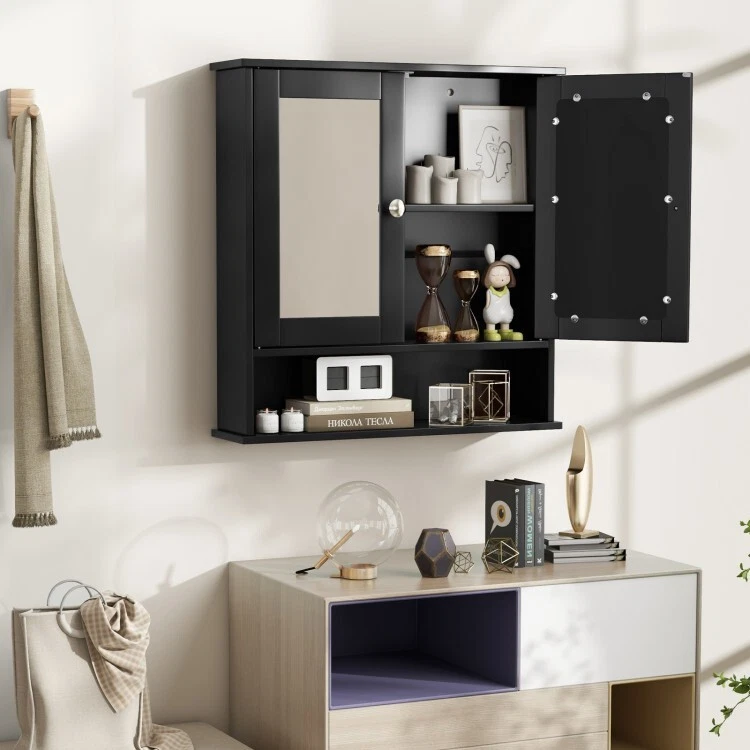 Double Door Wall-Mounted Medicine Cabinet Bathroom Organizer w/Adjustable Shelf ● Adjustable Large Storage Space: Layered design allows you to organize your items and keeps your room clean and tidy. The interior comes with a height adjustable shelf to fit larger items as needed. The lower shelf provides an open space for easier access to items. ● Double Doors with Mirrors: This cabinet comes with 2 doors which adopt magnetic door catch, keeping the door closed tightly and safely when not in use. High-definition mirrors on both doors offer convenience for your daily makeup or shaving. ● Durable and Sturdy Cabinet: Made of environmental-friendly MDF, our wall cabinet has solid texture and not easy to crack and deform even in a damp room. It can be firmly fixed on the wall and has large load bearing capacity, which is enough for your daily need to place items. ● Stylish Design and Multiple Use: Simple and stylish appearance integrates into your home decoration perfectly and not stand out. This wall cabinet is suitable for multiple places, such as bathroom, bedroom, corridor and so on, to create additional storage space. ● Easy to Assemble and Clean: Every panel and small part is numbered for easy distinction. With detailed instruction, assembly is quick and effortless. Since the surface is smooth and waterproof, it's easy to maintain cleaning only by gentle wiping with a damp cloth. Overview -Large open shelf and inner space to store your various daily items -Adjustable shelf with 3 heights to meet different storage needs -Comes with a mirror on both doors for your everyday makeup -Wall mounted design saves floor space and ensure the versatility -High quality MDF ensures strong stability and long-lasting use -Exquisite and humanized knob allows you to easily open the door -Magnetic door holder help close the door with low noise and tightly -Elegant and simple appearance fits well with any home decor -Ideal for various places, like bathroom, living room, entryway, etc Color (as Picture Show) Material MDF, Galss Product dimension 22" x 5" x 23"(L x W x H) Weight capacity of each shelf 11 lbs Net weight 15 lbs