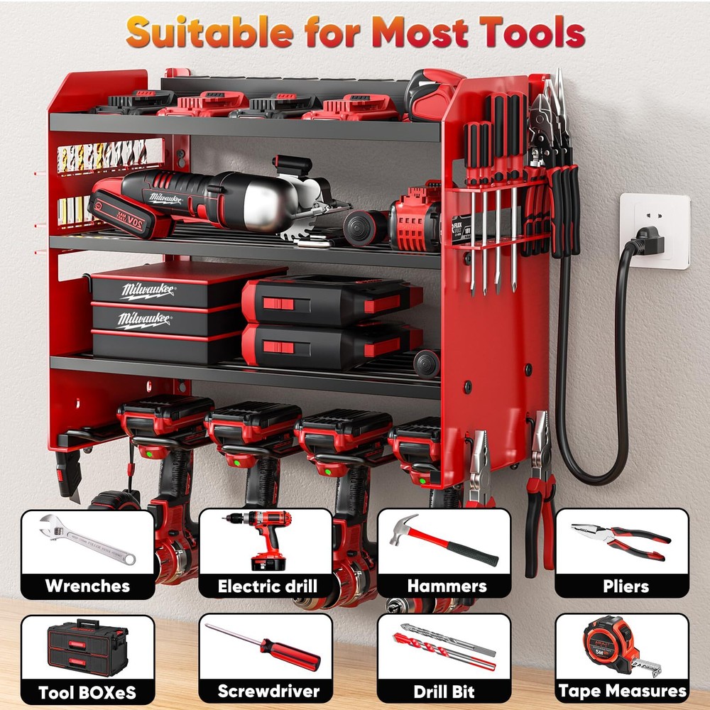Power Tool Organizer Wall Mount with Charging Station,Tool Storage Rack with 8 Outlet Power Strip,Heavy Duty Metal Battery Utility Rack with 4 Cordless Drill Holder 6.56 Ft Cord for Garage High-Quality Metal Bearing Capacity of 300 Lbs:Our power tool organizer wall mount with charging station is constructed from high-quality and heavy-duty metal materials. The industrial metal has undergone extensive load-bearing tests, allowing it to support up to 330 lbs. You no longer need to worry about the shelf breaking or falling off the wall. Our power tool holders can accommodate power tools of any weight. Power Tool Organizer with 8-Outlet Power Strips: Our garage shelf wall mount is designed to charge your tools, eliminating the need to search for an outlet. You can easily charge your tools on the shelf, which not only resolves your storage issues but also offers a convenient solution for charging tool batteries. Please note that the product includes a 6-foot (2-meter) power cord. 4-Tier Tool Rack Accommodates Most Tools:The wall-mounted tool storage rack with power strip features 2 Side Drill Bit Rack,4 Hooks, Two Shelves,8 Slots For Drills, and 8 outlets power strip. It can accommodate all your tools, including your charging station, batteries, toolbox, drill, hammer, Screwdriver, and other garage equipment, without any additional hassle. This organizer enhances your storage space significantly. Quick Installation:We offer professional manuals and high-quality installation accessories, allowing you to assemble a perfect garage cordless drill holder in just a few minutes. Whether you mount it on a wooden wall, concrete surface, or pegboard, this tool rack wall hanger fits seamlessly! Feel free to use it to store your tools! Save Space and Keep Your Space Clean:Are you still struggling with a cluttered tool area? Our upgraded power tool battery shelf measures 16.5 inches in length, 8.7 inches in width, and 12 inches in height. It is designed to accommodate a variety of tools, helping to keep your tools organized and your workbench space tidy. This shelf is perfect for use in a warehouse, tool room, garage, workshop, and more. Our garage wall organizer maximizes storage space effectively. Power Tool Organizer Wall Mount with Charging Station Shipping We offer FREE shipping on all orders! We ship within Three business days of payment, usually sooner. We use a selection of shipping services such as UPS, FedEx, USPS etc. We only ship to the lower 48 states, no APO/FPO addresses or PO Boxes allowed. Local pickups and combined shipping options are not provided at this time. Return You can return a product for up to 30 days from the date you purchased it. Any product you return must be in the same condition you received it and in the original packaging. Please keep the receipt. Payment We accept payment by any of the following methods: PayPal Please pay as soon as possible after winning an auction, as that will allow us to post your item to you sooner! Feedback Customer satisfaction is very important to us. If you have any problem with your order, please contact us and we will do our best to make you satisfied. Contact Us If you have any queries, please contact us via ebay. We usually respond within 24 hours on weekdays. Please visit our eBay store to check out other items for sale! Thank you for shopping at our store.