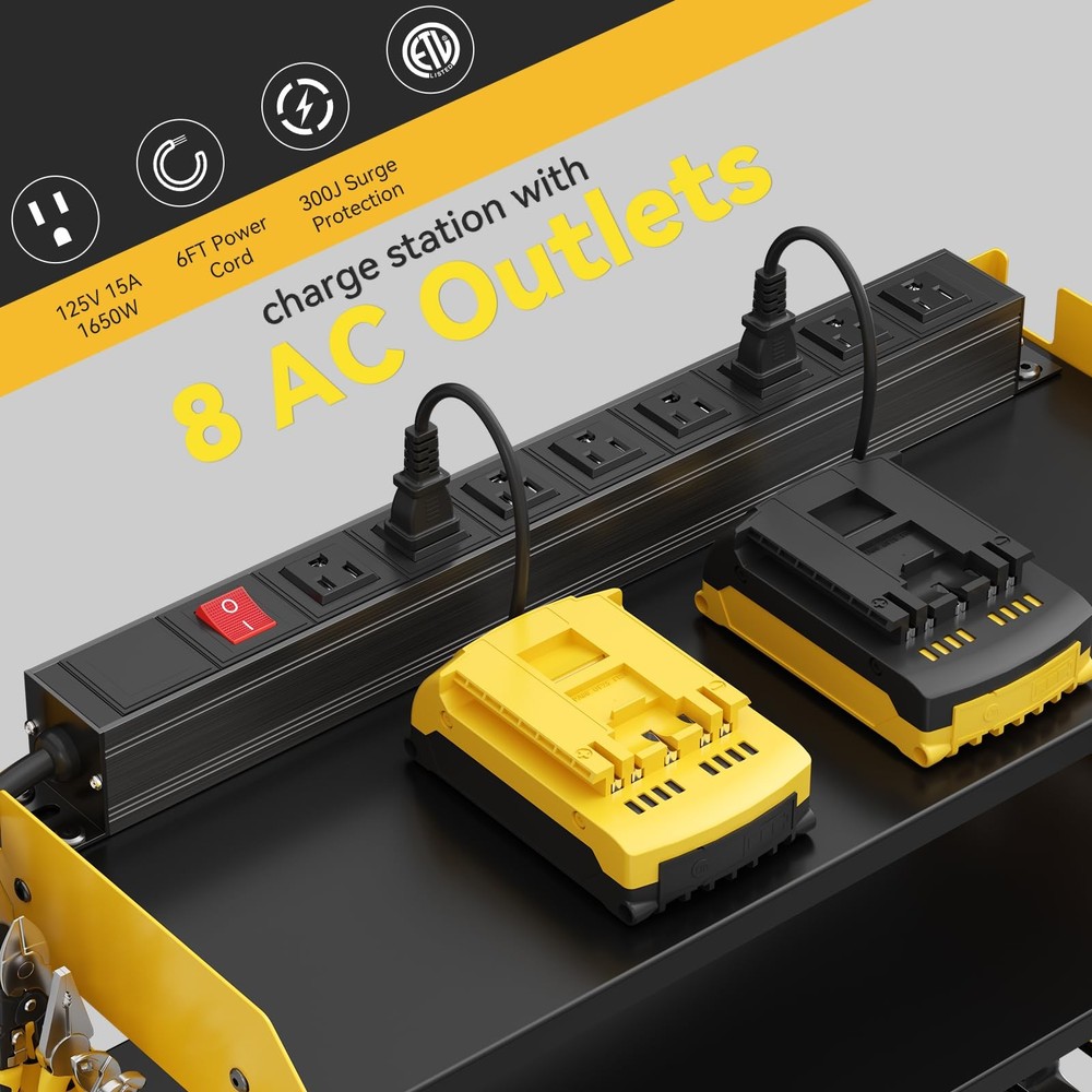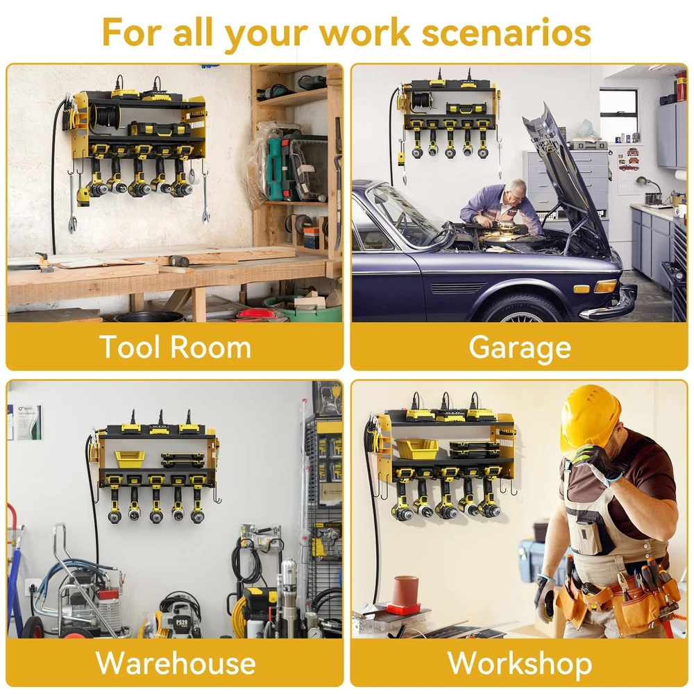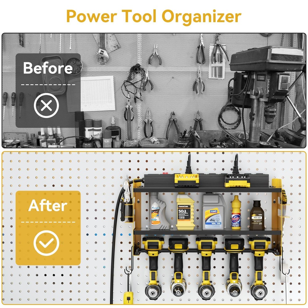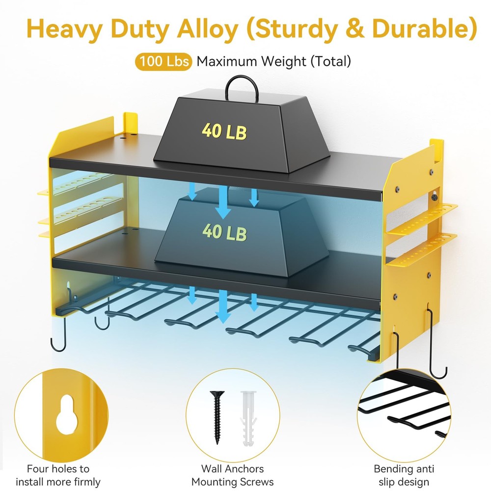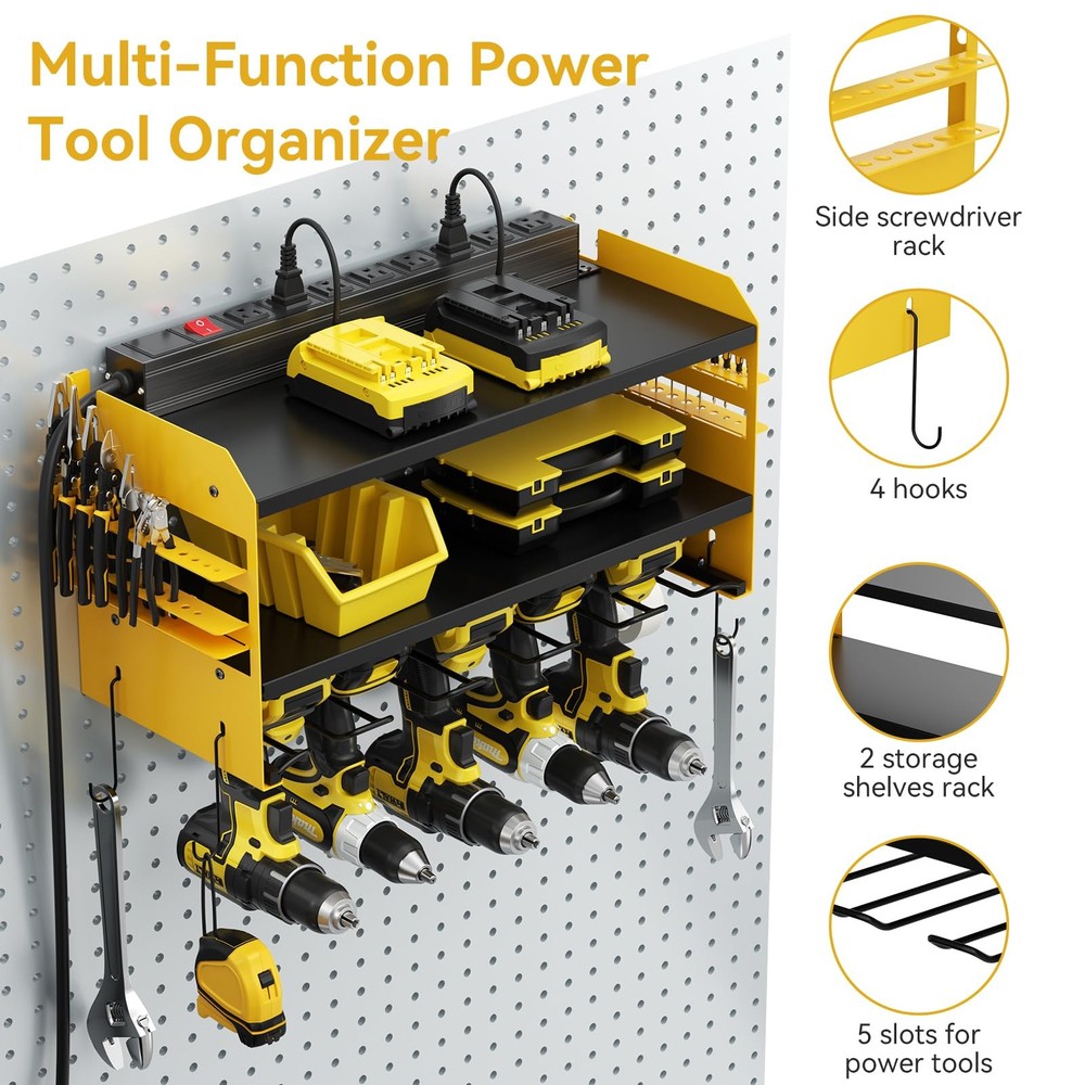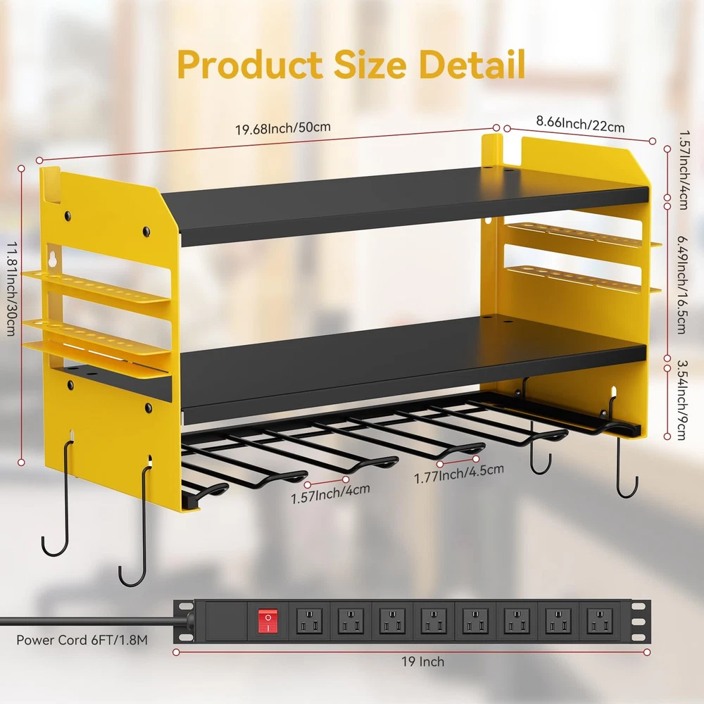 Power Tool Organizer Wall Mount with Charging Station,Power Tool Battery Storage Rack Built in 8 Outlet Power Strip Garage Drill organizer,5 Drill Storage Shelf with Hooks, Screwdriver,Drill Bit Rack,Garage 5 Drill Storage Shelf with Hooks, Heavy Duty Rack 【 Garage Organization Tools】Wall mount power tools organizer with power strip,2 tier storage shelf, 5 slots, 4 hooks and 2 side tool organizer.can keep rechargeable tools organized in the work area and save your bench space.The tool storage organizer can be mounted on concrete, drywall, or pegboard. 【Built in 8 Outlet Power Strip 】Power Tool Organizer with Charging Station is very convenient for charging your tool batteries, All-in-one design and the metal power strip with surge protection of 300 J, Able to protect your device to a certain extent, output: 125V/15A/1875W, 6ft 14AWG power cord. Garage organize utility rack size: L:19.68 in * W:8.66 in * H:11.81 in,8 Outlet Power Strip is 19 in. 【Compact Design & Muti-use Workplace 】Our power tool storage rack is suitable for both indoor and outdoor use and compatible with pegboards. You can store your charging stations, batteries, toolboxes, drill bits, hammers, and other garage tools without any extra hassle. Say goodbye to clutter and hello to a well-organized workspace! This Heavy Duty Metal 5 Drill Holder not only keeps your tools in order but also adds a touch of sophistication to your workshop. 【Heavy Duty Alloy Frame】The Modular Power Tool Organizer Wall Mount with Charging Station is constructed with a reinforced alloy frame, ensuring it can withstand heavy loads.Each layer of the storage shelf can support a maximum weight of 40 IB,and max capacity 100 lb.The alloy surface coating not only adds a sleek matte finish but also provides enhanced durability by resisting rust and oxidation. Your tool shelf will stay in top condition. 【Easy To Assemble And Hang】 The installation process of the drill stand wall mount bracket is very simple,please follow the instructions, come with all the tools needed to put it together, please test the power supply before assembly. Wall mount design, very easy to mount on the wall. It only takes a 10-15 minutes to assemble the perfect heavy duty floating tool holder.