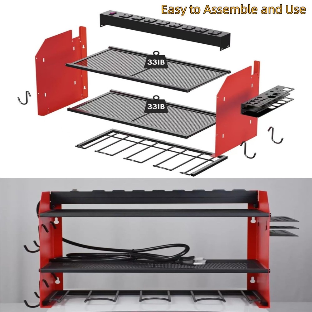 This power tool storage rack has a built-in power base and is equipped with 4 drill bit holder slots, 4 hooks and drill bit holders. The 2-layer adjustable structure can place tool items in an orderly manner. A tool box is added on the side to store commonly used drill bits, tweezers, The screwdriver is also equipped with four hooks for hanging tools such as tape measures or wrenches to increase storage diversity. Our 8-plug socket allows you to charge all your tools right on the shelf, eliminating the need to search for an outlet, making charging easier and faster. Tool rack measures approximately: 16.5 inches long * 9 inches wide * 11.8 inches high, and weighs approximately 8.8 pounds. Made of thickened heavy-duty steel metal, it has stronger load-bearing capacity and is more durable. It is equipped with hexagonal expansion bolts for stronger load-bearing capacity. No need to worry about the shelf breaking or the tool rack falling up and down from the wall. The power tool storage rack is easy to assemble and install, you just need to connect the side panels and rack with screws and fix it to the wall. Whether you install it on a wood wall, concrete surface, or nail board, this tool rack wall mount mounts easily and securely. Versatile, it can be used in tool rooms, garages, workshops and more, and can be mounted on the side of a work van or box truck or completely removed for custom storage, allowing you to organize your tools and equipment as needed. Makes a great gift for men Tool rack measures approximately: 16.5 inches long * 9 inches wide * 11.8 inches high, and weighs approximately 8.8 pounds. Made of thickened heavy-duty steel metal, it has stronger load-bearing capacity and is more durable. It is equipped with hexagonal expansion bolts for stronger load-bearing capacity. No need to worry about the shelf breaking or the tool rack falling up and down from the wall This power tool storage rack has a built-in power base and is equipped with 4 drill bit holder slots, 4 hooks and drill bit holders. The 2-layer adjustable structure can place tool items in an orderly manner. A tool box is added on the side to store commonly used drill bits, tweezers, The screwdriver is also equipped with four hooks for hanging tools such as tape measures or wrenches to increase storage diversity Power tool organizer with charging station, equipped with 8 sockets, you can charge all your tools on the shelf without having to find sockets, making charging more convenient and faster The power tool storage rack is easy to assemble and install, you just need to connect the side panels and rack with screws and fix it to the wall. Whether you install it on a wood wall, concrete surface, or nail board, this tool rack wall mount mounts easily and securely Tool racks are versatile and can be used in tool rooms, garages, workshops and more, they can be mounted on the side of a work van or box truck, or they can be completely removed for custom storage, allowing you to organize your tools and equipment as needed. Makes a great gift for men