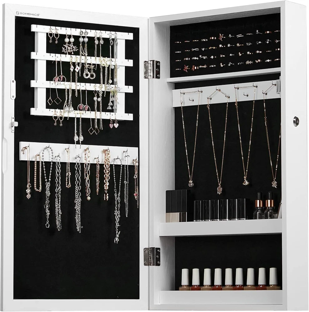 Product Description Earring Storage Keep your earrings and studs in pairs and in order for you to fetch them easily. Sturdy and Durable This jewelry cabinet crafted with MDF will serve your beauty routine for years. Lockable The lockable cabinet with two keys allows you to store your accessories safely. Installation Holes They help you easily hang the jewelry cabinet with mirror on the wall. A Must-Have for Your Beauty Routine: Before work or a fun night out, isn't it great to have a place where you can get ready? Stylish and practical, this SONGMICS jewelry armoire is perfect for you! Small Jewelry Cabinet for Flexibility: With the size of 3.9''D x 14.6''W x 26.4''H, the small jewelry cabinet takes up a little space. It can be mounted anywhere in your home, hallway, bathroom, and bedroom, etc. Organize Your Jewelry in One Place: Open the mirrored door to reveal a spacious area for your gems and jewels. Clear partition enables you to see your frequently used items at a glance, making daily dressing up a quick process. Specifications: Color: White Material: MDF (Medium Density Fiberboard), Glass Mirror, Velvet Lining Product Size: 3.9''D x 14.6''W x 26.4''H (10 x 37 x 67 cm) Product Weight: 11.5 lb (5.2 kg)