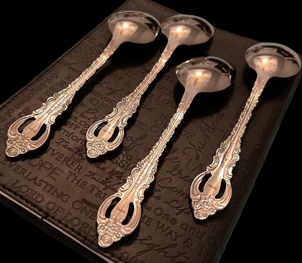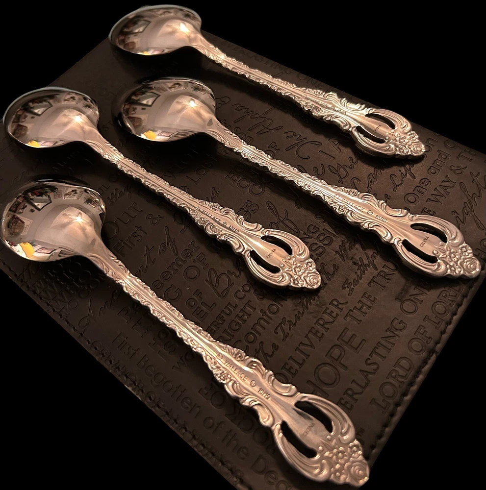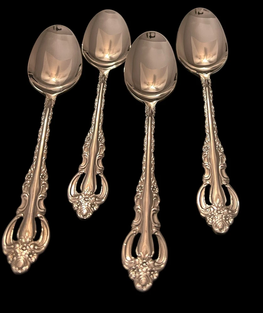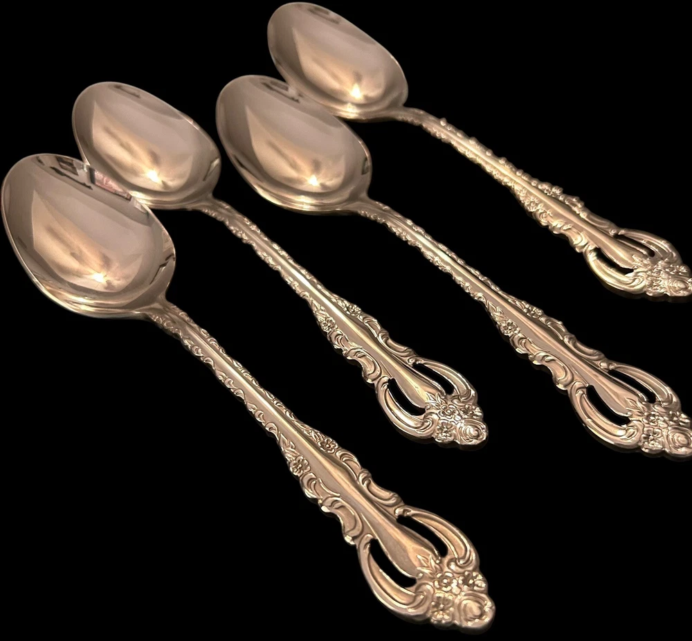 The Wallace Countess 18/10 Stainless Oval Place Soup Spoons 4Pc Set features an antique style with a Countess Pierced handle pattern. Made of stainless steel with a glossy finish, these soup spoons are 7 inches long and weigh 2 oz each. The set includes four teaspoons that are dishwasher safe. Suitable for all occasions, this flatware set is designed for adults and is crafted in China by the Wallace brand.