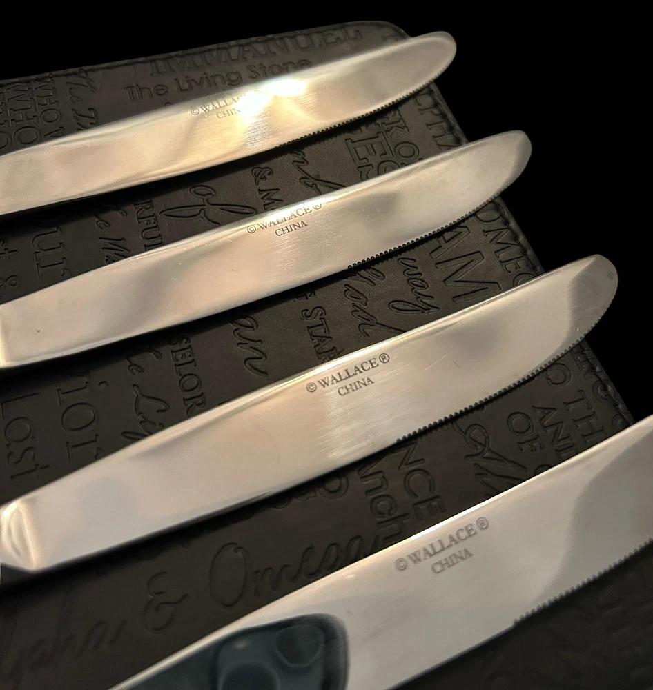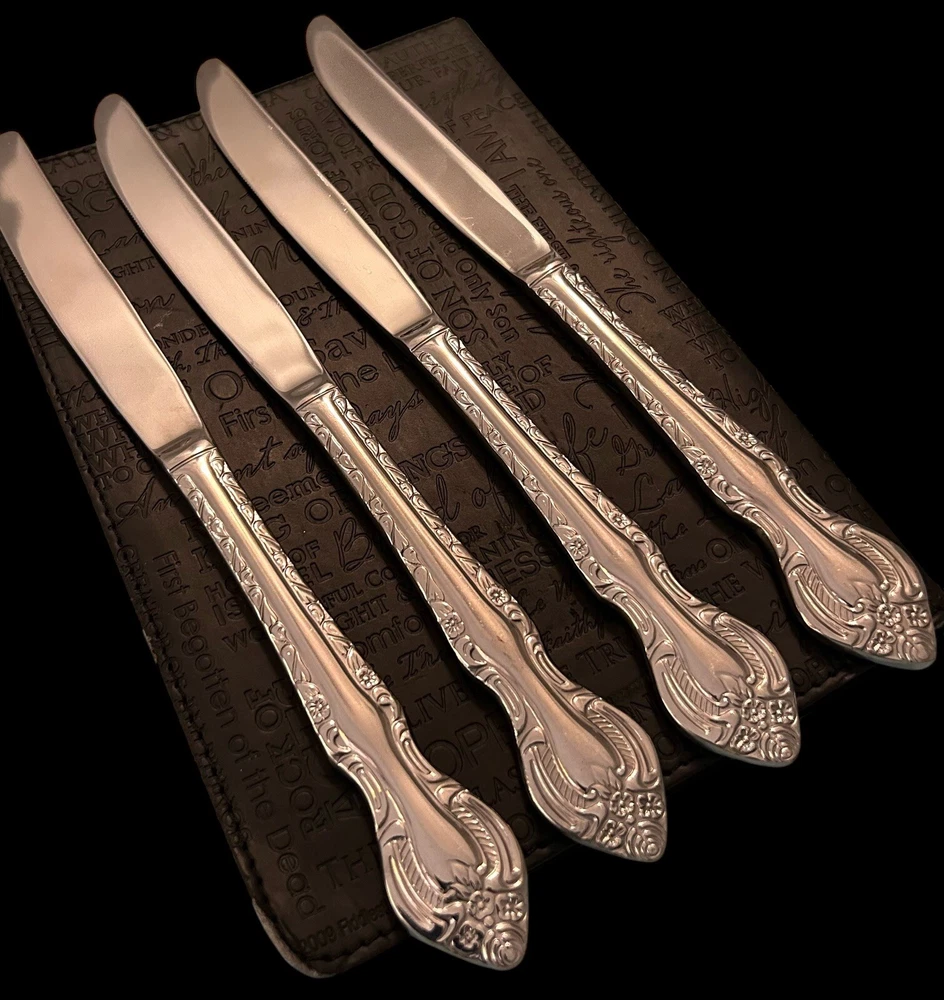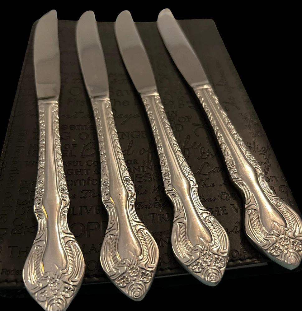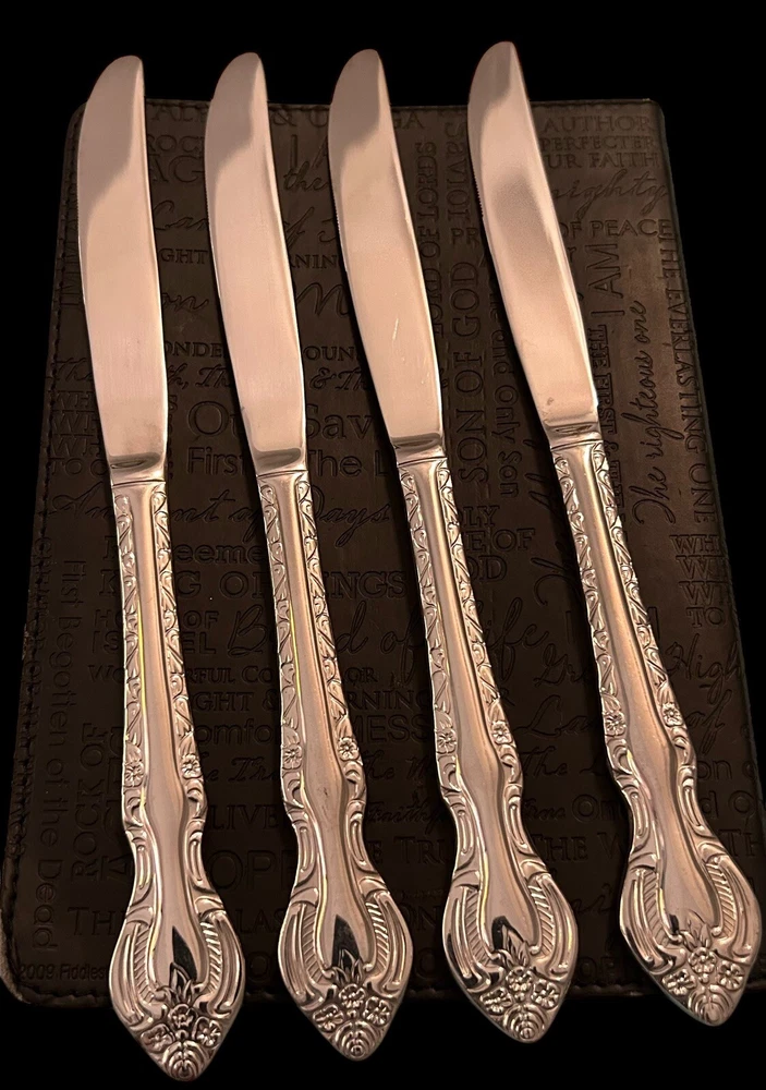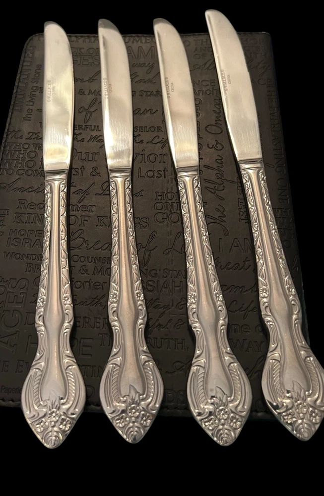 The Wallace Countess Dinner Knife Set includes 4 pieces of glossy stainless steel dinner knives, each measuring 9 1/2 inches in length. The set is dishwasher safe and features an antique style with a Countess handle pattern. Ideal for all occasions, this flatware set is part of the Countess collection by Wallace and is made of durable 18/10 stainless steel.