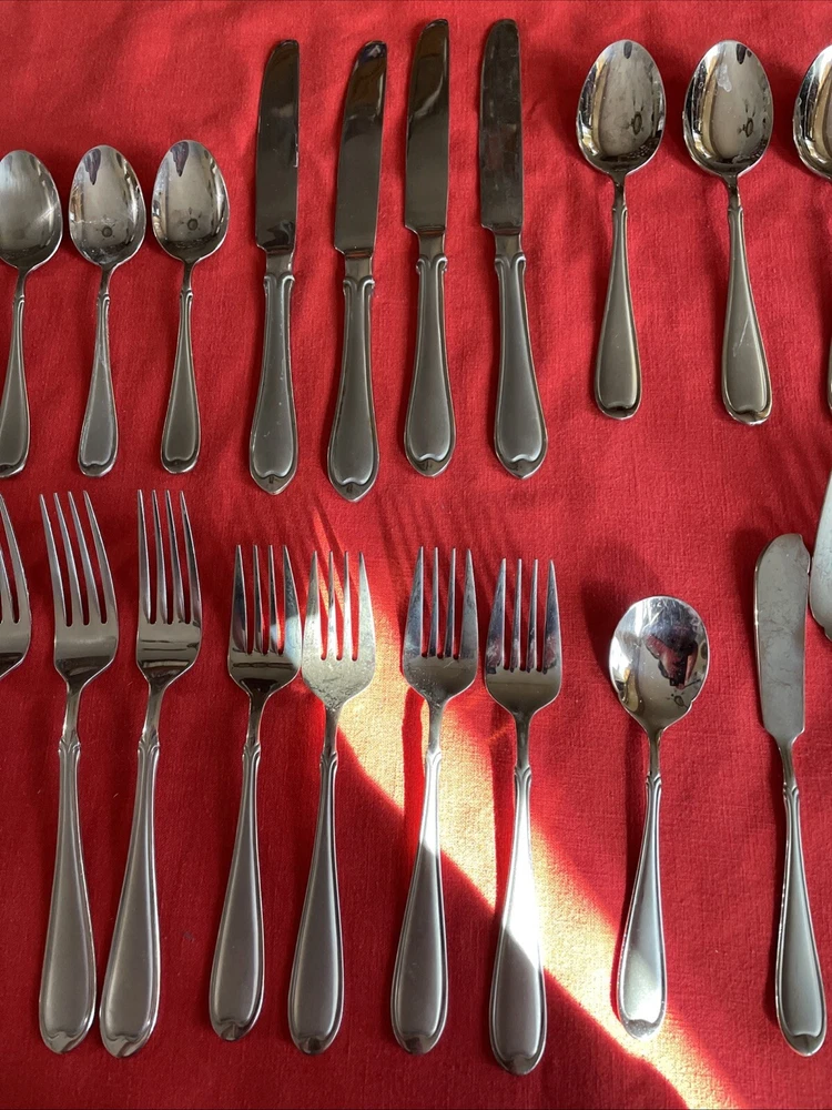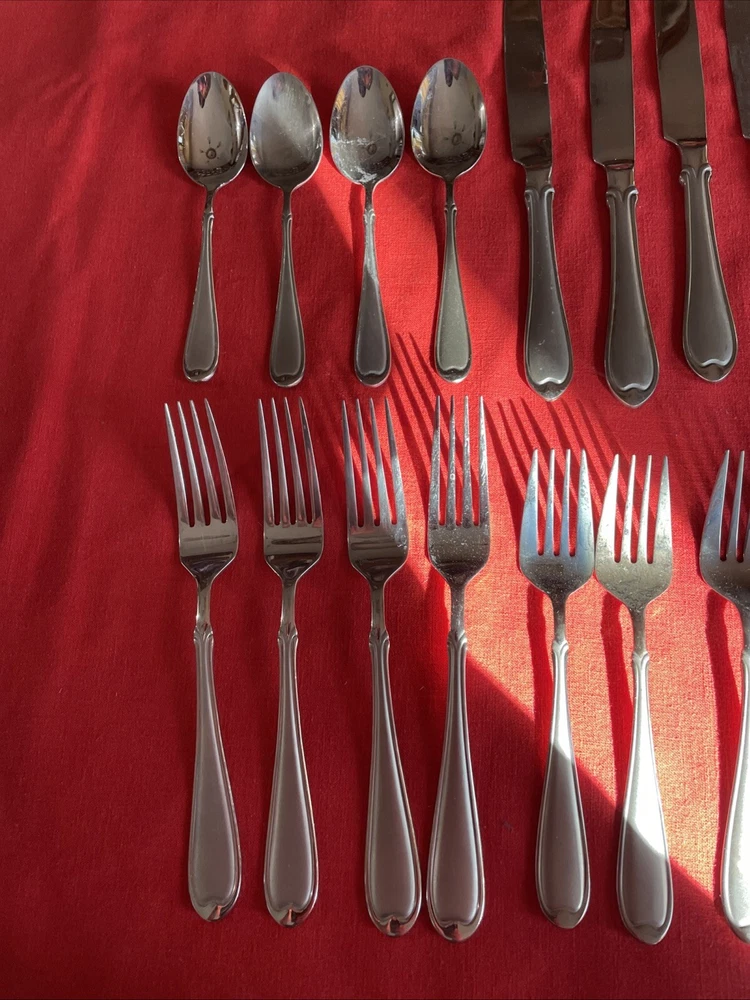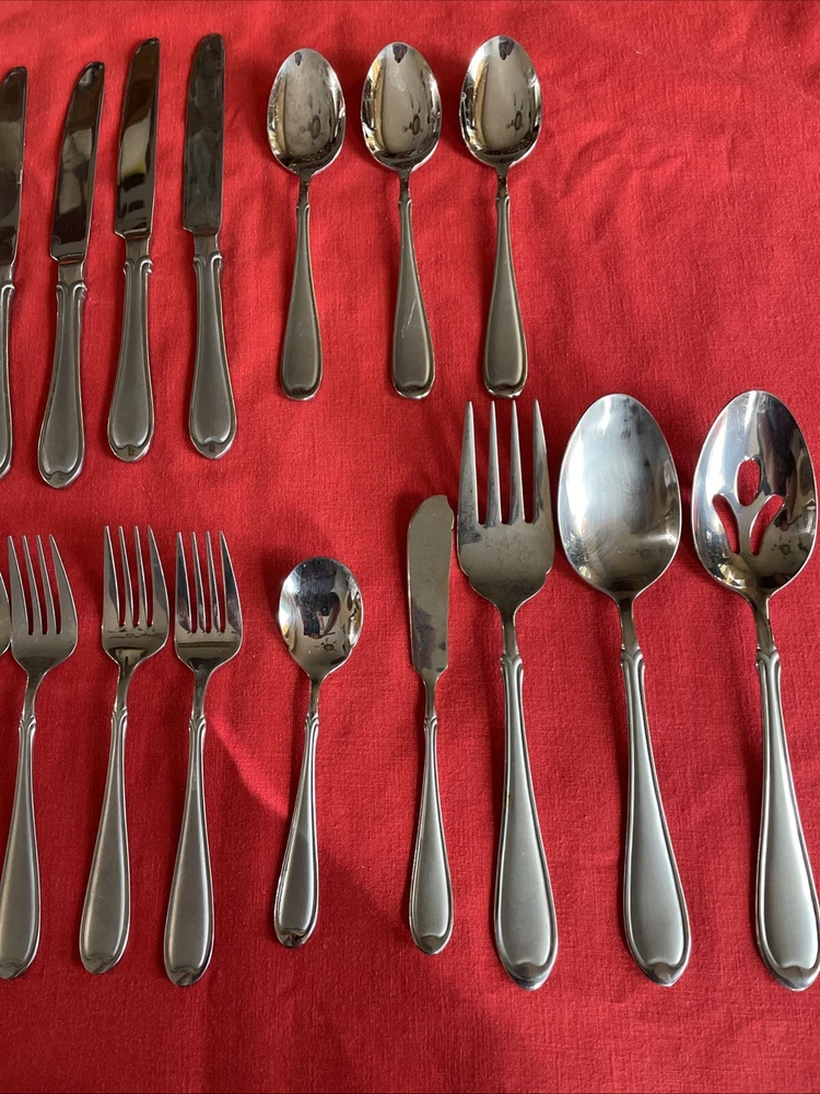 * missing one soup spoon Elevate your dining experience with the Wallace Summerset Frost 18/10 Stainless Steel Flatware Set. Crafted from premium stainless steel, this 24-piece set includes forks, knives, spoons, and a serving set, all designed with a sleek silver finish that complements any table setting. The durable handle material ensures a comfortable and secure grip, perfect for everyday use or special occasions.