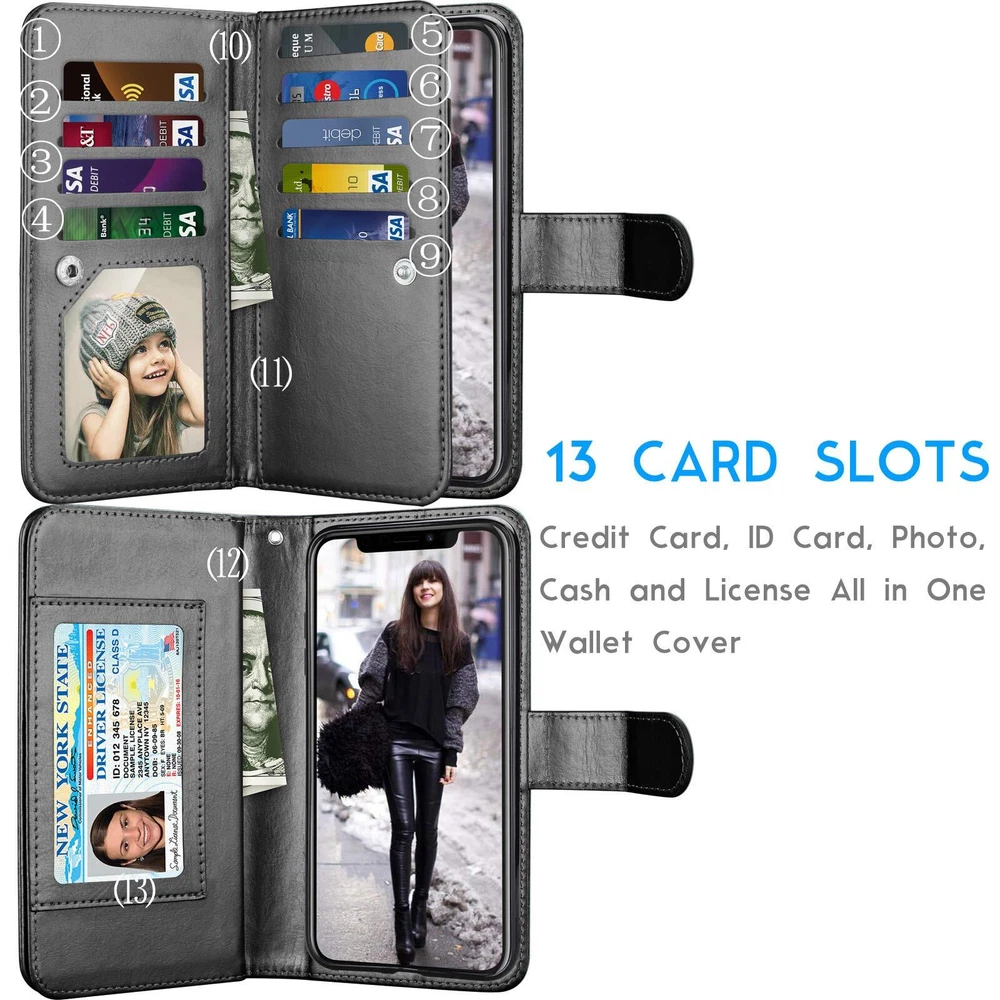 Features: 1.Premium Synthetic PU Leather stylish wallet case.Inside of case is made of TPU material that will not scratch your phone. 2.Built-in Card Pockets to Conveniently Store IDs and Credit Cards.Included 9 card slots, 3 money pocket Slots and 1 license Slots. 3.It's also tear-resistant, anti-scratch and anti-fingerprints. 4.The detachable hard magnetic case allows you to carry the phone without the wallet attached at your convenience. 5.Thinness without compromising Phone security.Precise openings allow direct access to all features of the phone without removing the case & protect the camera perfectly. 6.Wrist lanyard allows for convenience and quick, easy access to use it in everywhere.And it also gives fresh looking for your phone. 7.Included magnetic clip.flip cover folded as a phone stand, giving you the convenience to watch videos and movies with desired comfort. And it will not effect the signals. Compatible with: iPhone 11 / iPhone11 (6.1 inch display) Package Includes: - Wallet Series Flip Cover Case - Hand Strap Wallet Carrying Pouch Case, Built-in 11 Card Solts Flip Cover Case ,Perfectly Compatible with iPhone 11 / iPhone11 (6.1 inch display) Released on 2019 AT&T Sprint Verizon T-mobile International unlocked Cricket U.S. Cellular Straight Talk All Carriers. Case For iPhone 11, This cover case is also multi-functional. Built-in Card Pockets & Sleeve conveniently store your ID, license,photo,cash and credit cards. Compatible For iPhone 11 Flip Cover,Wrist lanyard allows for convenience and quick, easy access to use it in everywhere.Case easily opens like a book with a built in kickstand that lets you make hands-free video calls, read, or watch movies anywhere comfortably For iPhone11 Leather Case For Ladies Girls Women Boys Men, User friendly design with precision cut-outs allow easy access to all buttons, camera, speakers, and connector without removing the case. Compatible For iPhone 11 Phone Case, provides protection against daily wear and tear, scratches, marks and scrapes.The detachable hard magnetic case allows you to carry the phone without the wallet attached at your convenience (The hard case part can attach on the refrigerator)