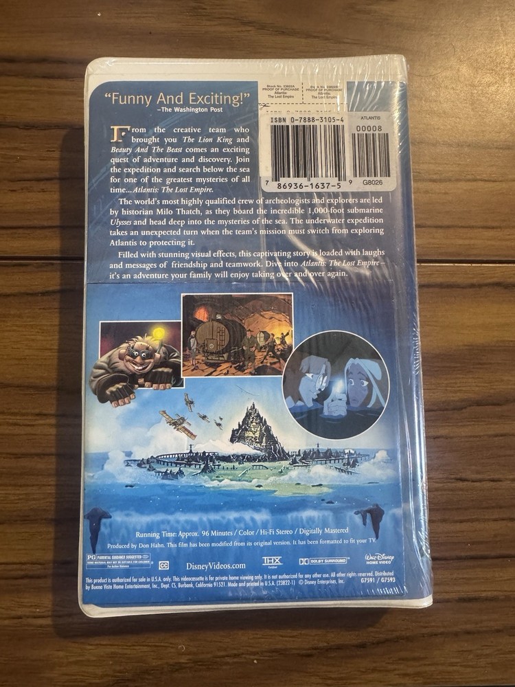 The Walt Disney Atlantis: The Lost Empire VHS NTSC Full Screen Animation Bonus CD is a nostalgic collectible featuring the English language version of the 2001 animated film. Directed by Gary Trousdale and Kirk Wise, this adventure-packed movie stars Milo Thatch as he discovers the secrets of the lost city of Atlantis. With a PG rating and special features like a bonus CD-ROM attached, this VHS tape is perfect for fans of children's and family films. The full screen edition captures the magic of the underwater world in stunning detail, making it a must-have for animation and anime enthusiasts.