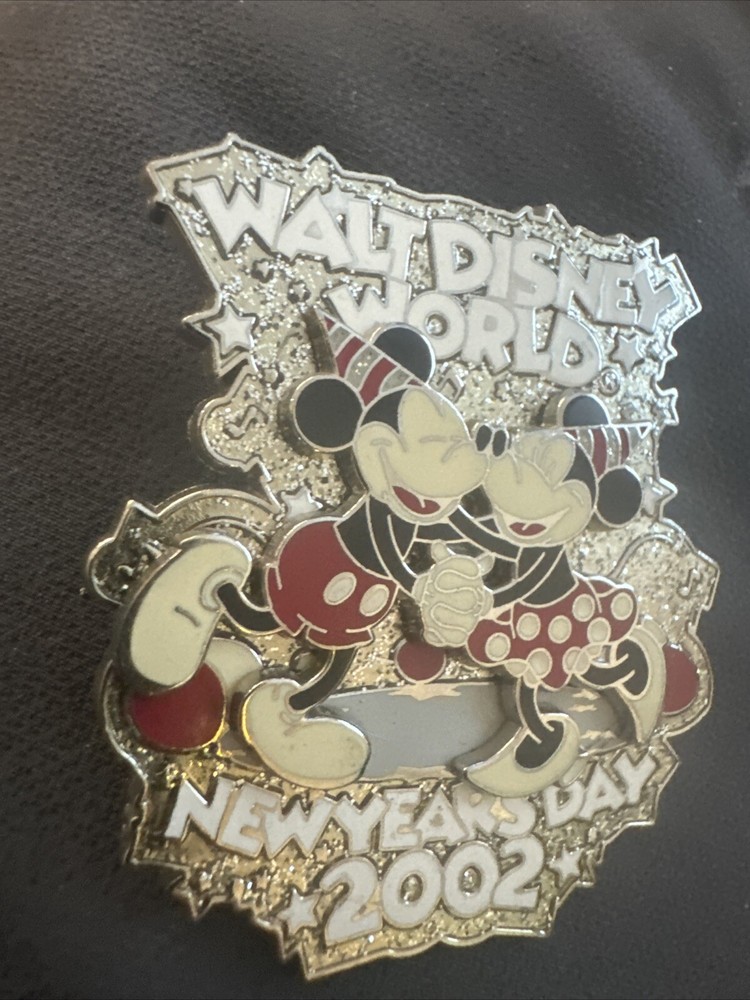 PP8994 WDW - Mickey & Minnie Mouse - New Years Day 2002 Front Description This pin, similar in style to 8993 features Mickey and Minnie, hands and noses together as they celebrate the year 2002. Mickey and Minnie can also can rock left and right. This pin was released on 01/01/02 property wide and sold out within hours.