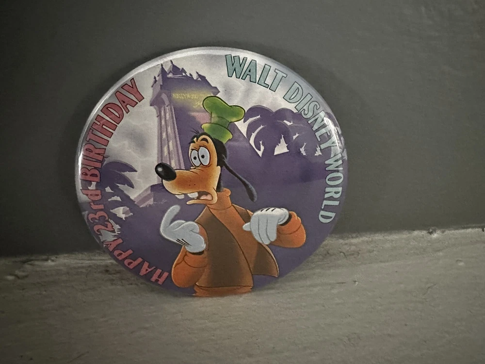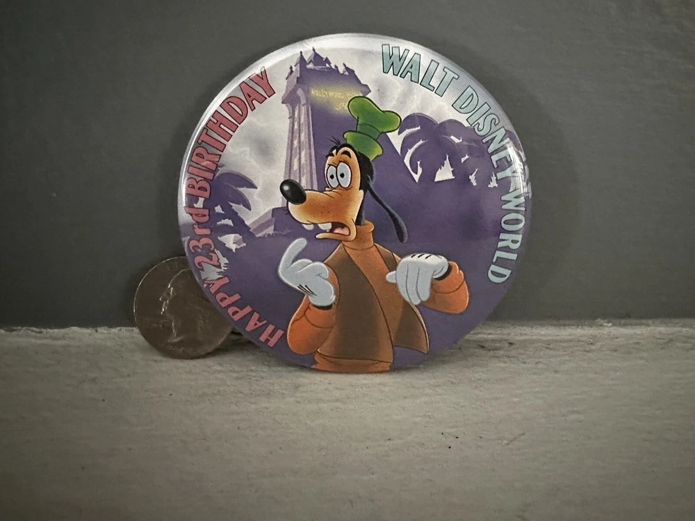 Celebrate Goofy's 23rd birthday with this commemorative pinback button from Walt Disney World. Featuring the lovable character in front of the Tower of Terror, this exclusive item is perfect for any Disney or Goofy fan. Made in 1994, this pin is a true piece of contemporary Disneyana. The pin is in great shape and has been kept as a collectible item. A must-have for any Disney pin, patch, or button enthusiast. Don't pass up the chance to add this unique item to your collection.