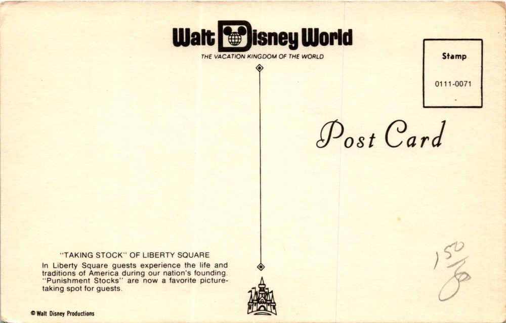 MAKE AN OFFER. THE MORE YOU BUY THE BETTER DEAL I WILL ACCEPT The postcard is promoting Walt Disney World, known as THE VACATION KINGDOM OF THE WORLD. It specifically highlights Liberty Square, where guests can immerse themselves in the life and traditions of America during its founding. One of the popular attractions mentioned is the Punishment Stocks, which have become a favorite spot for guests to take pictures.