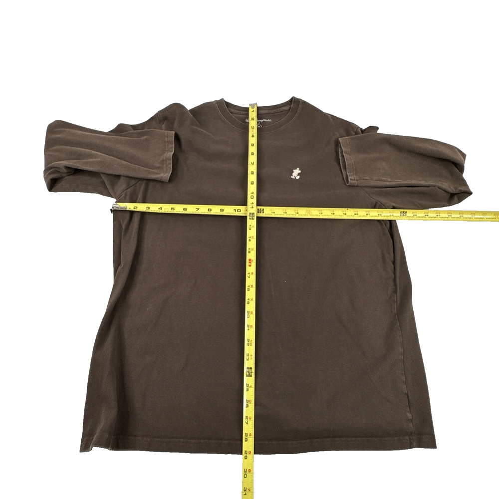 The product is a Walt Disney World Mickey Mouse brown long sleeve t-shirt in men's size 2X. This officially licensed shirt features the iconic Mickey Mouse character from the Disney franchise and is suitable for adults of any gender. The brown color adds a classic touch to the design, making it a must-have collectible for any Disney fan. Perfect for wearing around Walt Disney World or showing off your love for the beloved character.