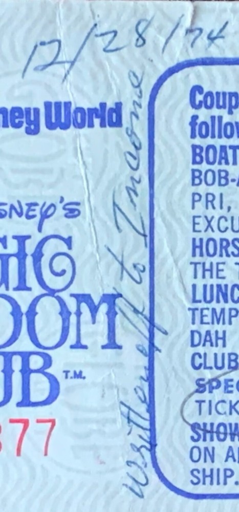 Walt Disney World - Coupon good for choice of ONE of the following: (USED) This is a Walt Disney World - Walt Disney's MAGIC KINGDOM CLUB This was for an adult 18 and over. The coupon is the large format ticket measuring 6" x 2½". Coupon is used and redeemed. It has stamped "Dec 28 1974" & For $5.75. Written in ink is "Written off to Income 12/28/74" Coupon good for choice of ONE of the following: BOATING – 1 Hour … CHOOSE A HOBIE, BOB-A-ROUND, PEDAL BOAT, SUNFISH, CAPRI, TRAPPER CANOE OR OUTRIGGER EXCURSION. HORSEBACK RIDING – TRAIL RIDE FROM THE TRI-CIRCLE D RANCH. LUNCHEON – TOP OF THE WORLD (CONTEMPORARY RESORT), PAPEETE BAY VERANDAH (POLYNESIAN VILLAGE) OR COUNTRY CLUB DINING ROOM (GOLF RESORT). SPECIAL – MAGIC KINGDOM CLUB TICKET BOOK. (Without Transportation) SHOWBOAT CRUISE – AN EVENING CRUISE ON AN OLD-FASHIONED SIDEWHEEL STEAMSHIP. ----------------------------------------------------------------------------------------------------------------------------------------- The back states: “These coupons are not refundable and may be used only for admission as indicated. Listed attractions are subject to availability. Alcoholic beverages are not included unless specified. Tax and gratuity included where applicable." Please ask questions before buying this item. To combine shipping with other items, contact me BEFORE buying it. Shipped USPS Ground Advantage with tracking.