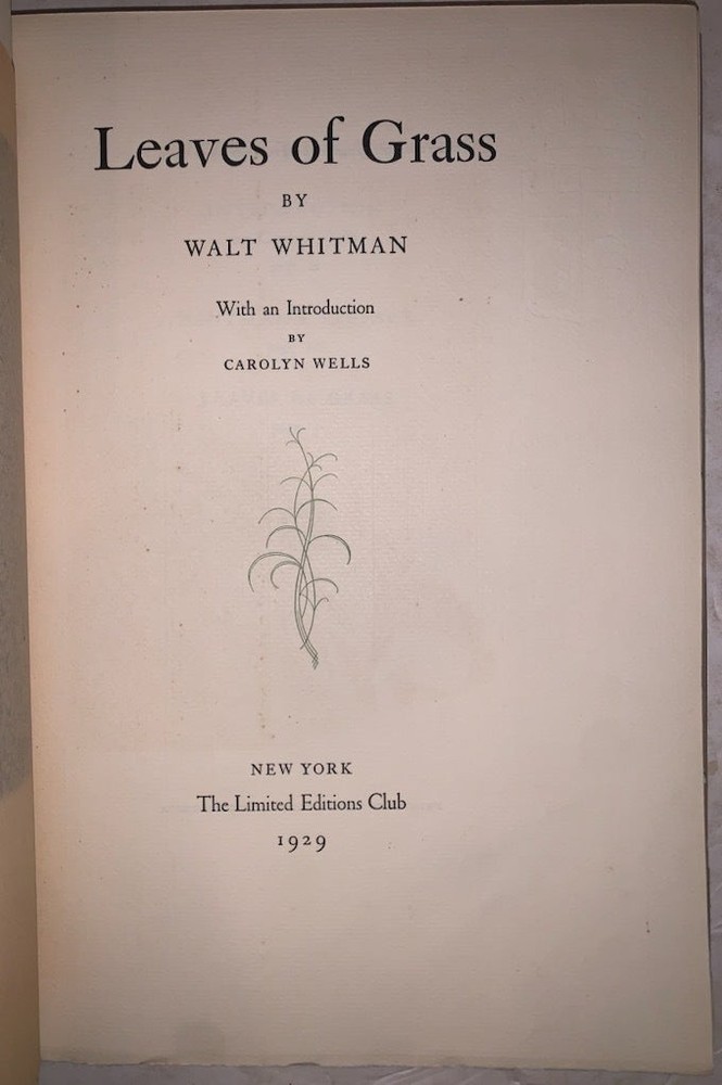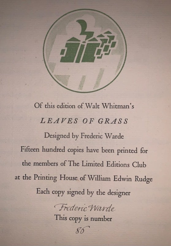 Leaves of Grass Author: Whitman, Walt. Signed Limited Edition Title: Leaves of Grass Publication: New York: The Limited Editions Club, 1929 Edition: First Edition. Limited Edition of 1,500 numbered copies, of which this is number 86. Signed by the designer Frederic Warde on the limitation page Description: Quarto, xlvi, 154 pages, publisher's original green cloth covered boards. Publisher's original grey dust jacket. Publisher's original grey slipcase. Top edge gilt. Leaves of Grass by Walt Whitman is a seminal work of American poetry that revolutionized literary expression with its bold, free verse and celebration of the individual. First published in 1855 and expanded throughout Whitman’s life, the collection explores themes of democracy, nature, the body, sexuality, and the spiritual interconnectedness of all things. Whitman’s innovative style—marked by long, flowing lines and a candid, expansive voice—broke from traditional poetic forms and embodied the democratic ideals of a young, evolving America. Central to the work is the poet’s persona, often seen as a stand-in for Whitman himself, who invites readers into an intimate and universal experience. Leaves of Grass continues to resonate for its visionary embrace of humanity and its unapologetic affirmation of life. The dust jacket is torn and missing the backstrip. Slipcase damaged and missing the top panel. Some slight rubbing, else in very good condition. Seller ID: 28 Subject: Limited Editions, Limited Editions Club, Literature, Signed books and autographs West Chester Books We are an online only, generalist rare and antiquarian bookstore located in historic West Chester, Pennsylvania. We carry thousands of books on various subjects. Terms All orders ship within one business day. Standard mail is USPS Media Mail. Expedited and international shipping are also available. We offer combined shipping on multiple orders. All items are guaranteed to be as described, or they may be returned within 30 days of receipt for a full refund. This listing was created by Bibliopolis.