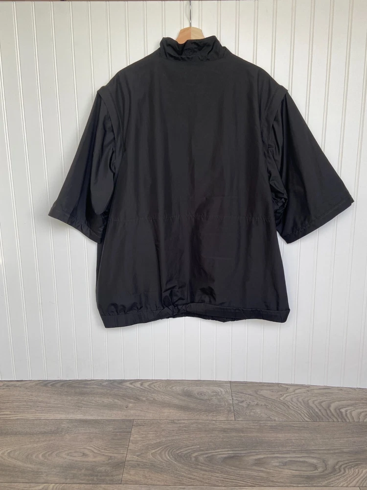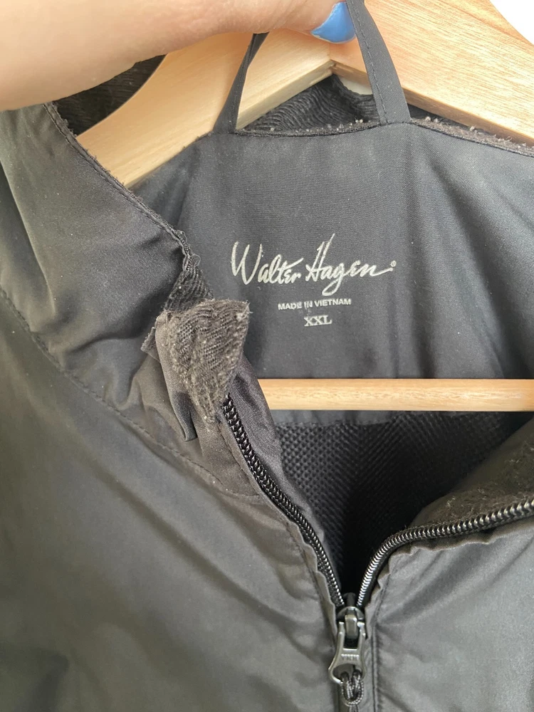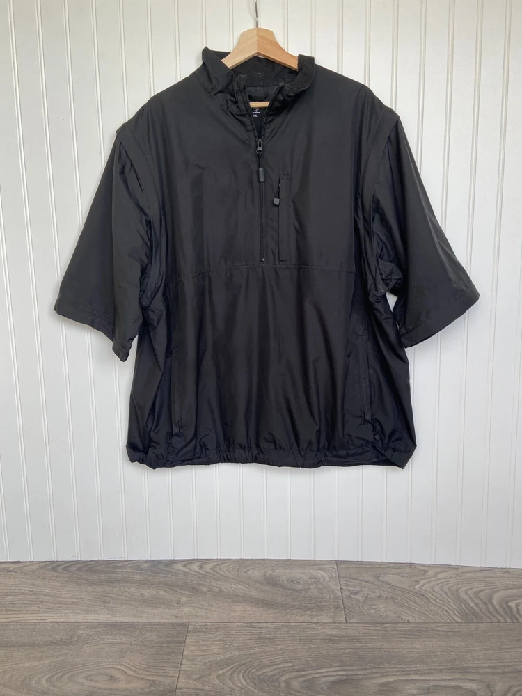 Elevate your golf game with this stylish and comfortable Walter Hagen Men's Pullover Shirt in size 2XL. The shirt is made of high-quality polyester material that is both durable and machine washable. It features a solid black color with a high neck and a pullover closure for easy wear. This shirt is perfect for any golf enthusiast who wants to look and feel great on the course. It comes with removable short sleeves that make it perfect for warm weather and a 1/4 zip closure that adds a touch of sophistication. The shirt is waterproof and perfect for any sports activity. Get ready to impress your golf buddies with this stylish and functional shirt. Removable sleeves (they zip off) Perfect condition. Pit to pit: 28" Length: 28"