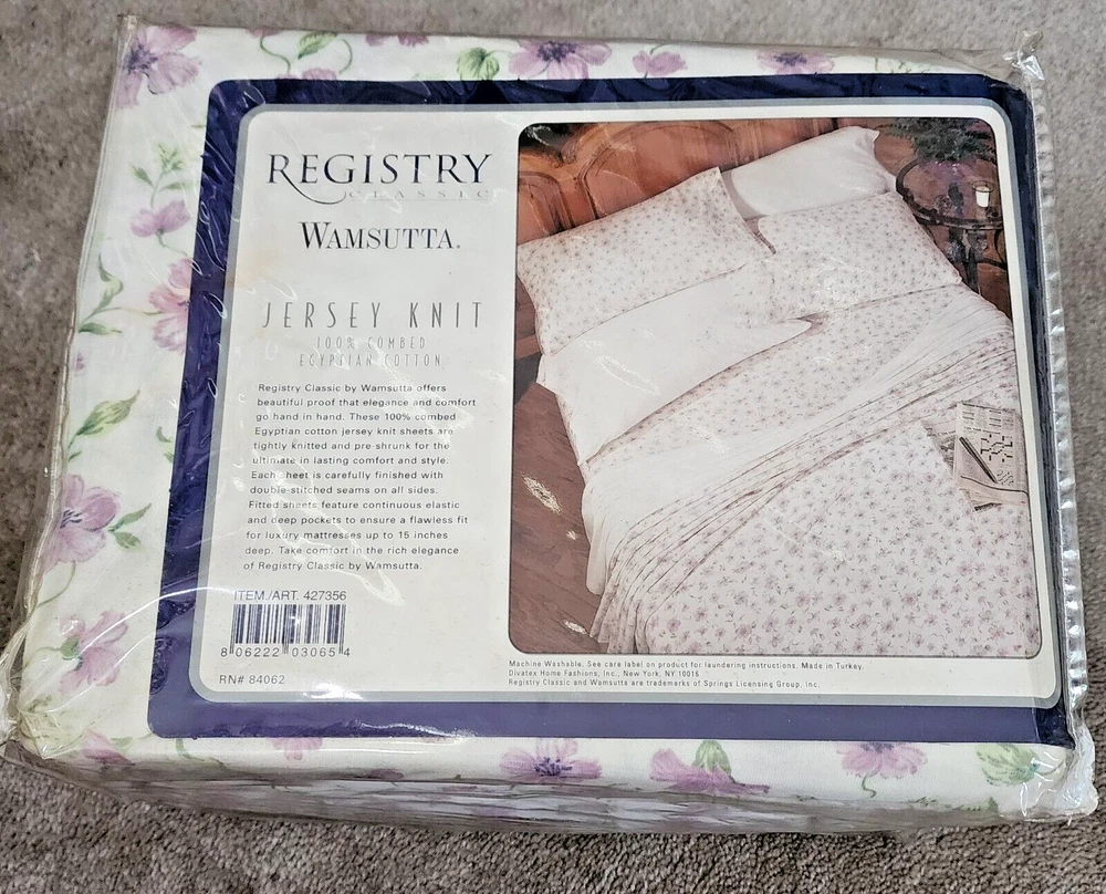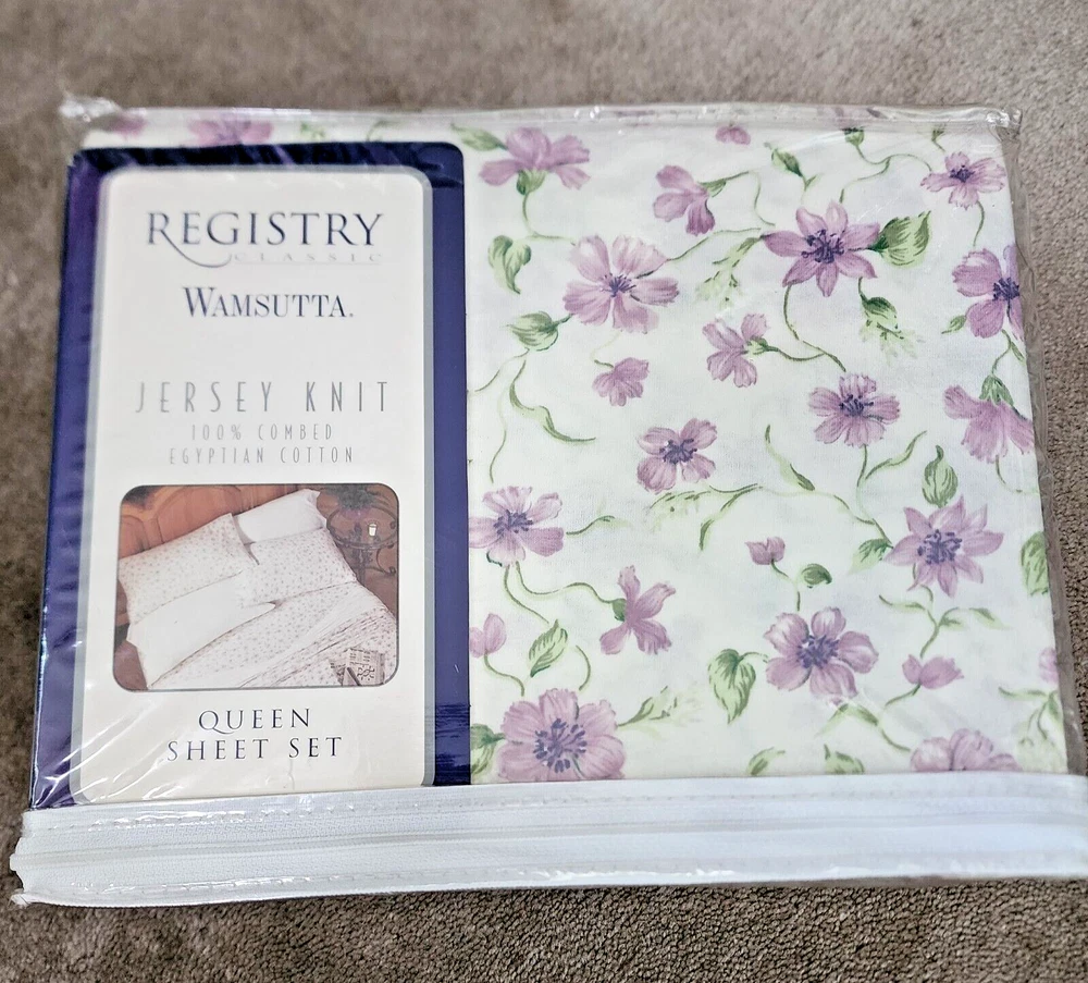 Wamsutta Queen Sheet Set 100% Combed Egyptian Cotton Jersey Knit Violet Floral One flat sheet, one fitted sheet, and two standard pillowcases. Super soft breathable cotton, like a favorite t-shirt! Fits mattress 60 in x 80 in. Fits up to 15 in deep mattress Brand new Registry Classics Wamsutta queen size sheet set. These 100% combed Egyptian cotton Jersey knit sheets are tightly knitted and pre-shrunk for the ultimate in lasting comfort and style. Each sheet is carefully finished with double stitched seams on all sides. Fitted sheets feature continuous elastic and deep pockets to ensure a flawless fit for luxury mattresses up to 15 in deep. Take comfort in the rich elegance of registry classic by Wamsutta. Offers considered Please message me with any questions or concerns. I ship within one business day of receiving payment.