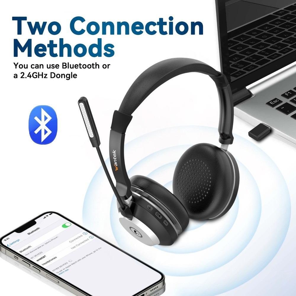 About this item ✅【AI Intelligent Noise Reduction Microphone】Wantek wireless headset for computer with AI environmental noise cancelation microphone, it can eliminate up to 99.99% of the ambient noise. So you can hear and be heard clearly wherever you are ✅【Bluetooth Headphones】On-ear headphones connect quickly to your phone or tablet via Bluetooth. Phone headset with built-in audio sound card ✅【Adjustable Headset】The padded headband of the wireless headset is adjustable and stretchable to fit your head perfectly, suitable for both children and adults. Soft protein memory foam ear cushions are made with premium breathable material, ROHS certified material prevents ear heat and sweat(The microphone return to home position can mute the function only applies to the call state) ✅【Battery Power】The Bluetooth headset provides up to 14 hours of continuous talk and 200 hours of standby time on a single charge, plus 2 hours of work time with a 10-minute quick charge. Long battery life brings convenience to your life ✅【24 Months Warranty】Maybe we can't be 100% satisfied with our electronic products, but we will try our best to be 100% satisfied
