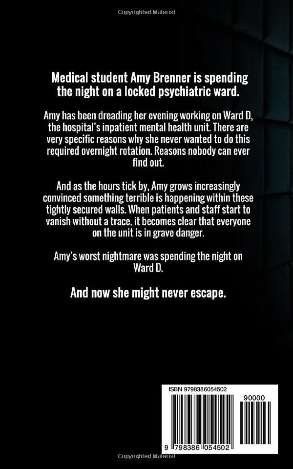 Ward D: A gripping psychological thriller Paperback – May 8, 2023 Medical student Amy Brenner is spending the night on a locked psychiatric ward. Amy has been dreading her evening working on Ward D, the hospital’s inpatient mental health unit. There are very specific reasons why she never wanted to do this required overnight rotation. Reasons nobody can ever find out. And as the hours tick by, Amy grows increasingly convinced something terrible is happening within these tightly secured walls. When patients and staff start to vanish without a trace, it becomes clear that everyone on the unit is in grave danger. Amy’s worst nightmare was spending the night on Ward D. And now she might never escape. Shipping We offer FREE shipping on all orders! We ship within Three business days of payment, usually sooner. We use a selection of shipping services such as UPS, FedEx, USPS etc. We only ship to the lower 48 states, no APO/FPO addresses or PO Boxes allowed. Local pickups and combined shipping options are not provided at this time. Return You can return a product for up to 30 days from the date you purchased it. Any product you return must be in the same condition you received it and in the original packaging. Please keep the receipt. Payment We accept payment by any of the following methods: PayPal Please pay as soon as possible after winning an auction, as that will allow us to post your item to you sooner! Feedback Customer satisfaction is very important to us. If you have any problem with your order, please contact us and we will do our best to make you satisfied. Contact Us If you have any queries, please contact us via ebay. We usually respond within 24 hours on weekdays. Please visit our eBay store to check out other items for sale! Thank you for shopping at our store.