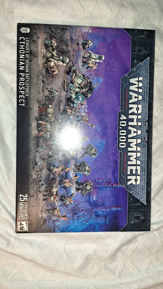 A perfect start to a brand new Leagues of Votann army. You get the Leagues of Votann Cthonian Prospect Battleforce, the New, 10th Edition Sealed Codex (plastic wrap still on, code still unused!), and an unused large miniature storage box (3 tiers, 40 model slots each, 120 slots total). the Cthonian Prospect Battleforce comes with -Brokhyr Iron-Master (and retinue) -Cthonian Beserks -Brokhyr Thunderkyn -2 Cthonian Earthshakers -Kapricus Defender/Carrier