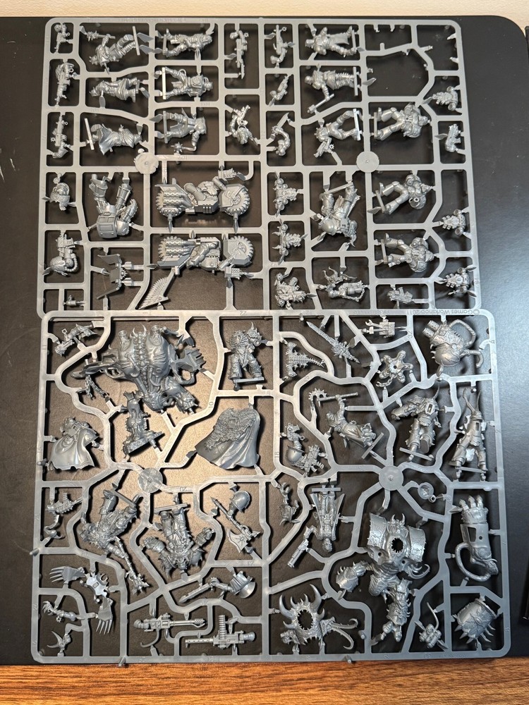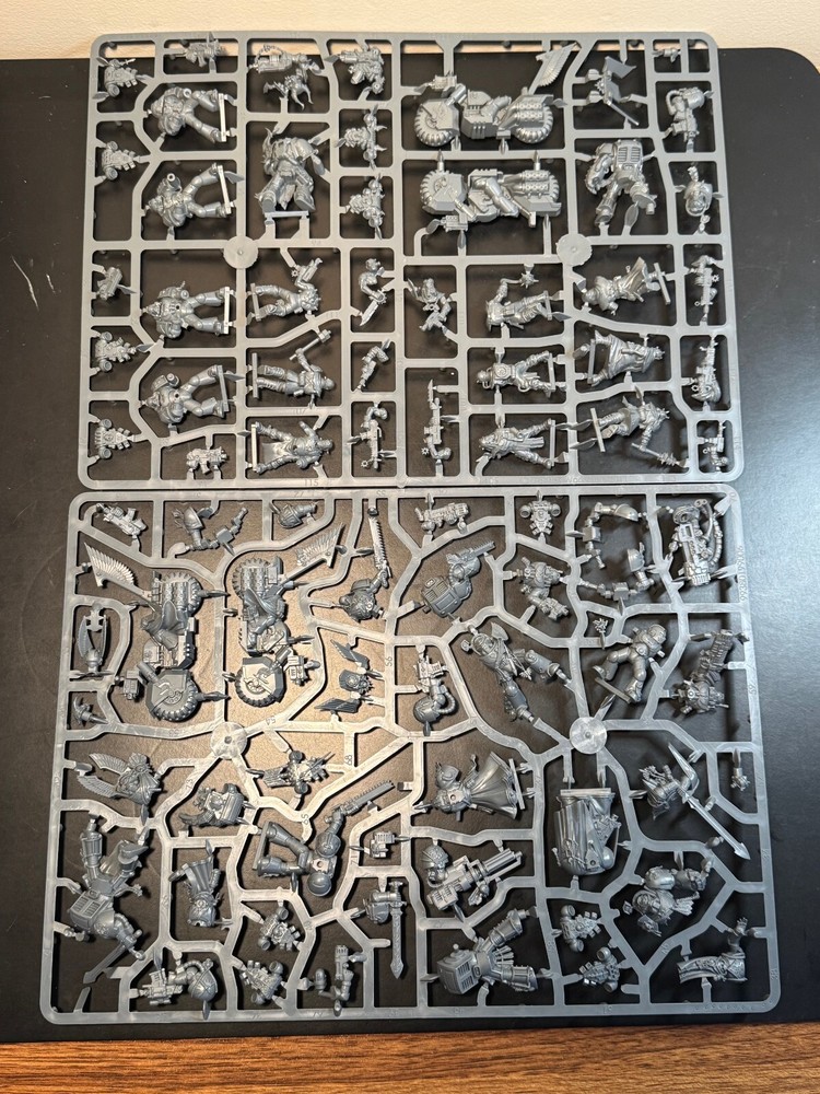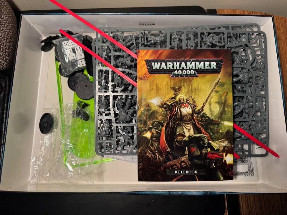 This Warhammer 40k Dark Vengeance box set is complete, with very unit still on sprues with the exception of 1 Tactical Marine (who is primed with Abaddon Black and included in the package). Contains: 1x Warhammer 40,000 168-page Mini Rulebook 1x Dark Vengeance 48-page How to Play booklet 21x Dark Angels Space Marines: 1x Limited Edition Dark Angels Interrogator-Chaplain Seraphicus 1x Dark Angels Company Master 1x Dark Angels Librarian 5x Dark Angels Deathwing Terminators 10x Dark Angels Tactical Space Marines 3x Dark Angels Ravenwing Bikes 28x Chaos Space Marines: 1x Chaos Space Marines Lord 6x Chaos Chosen Space Marines 1x Chaos Space Marines Hellbrute 20x Chaos Space Marines Cultists 1x Dice Pack 1x Warhammer 40,000 Templates Set 2x Range Rulers