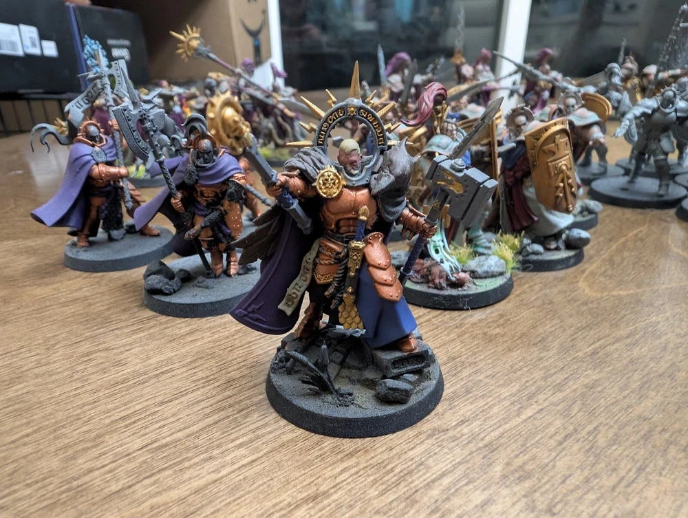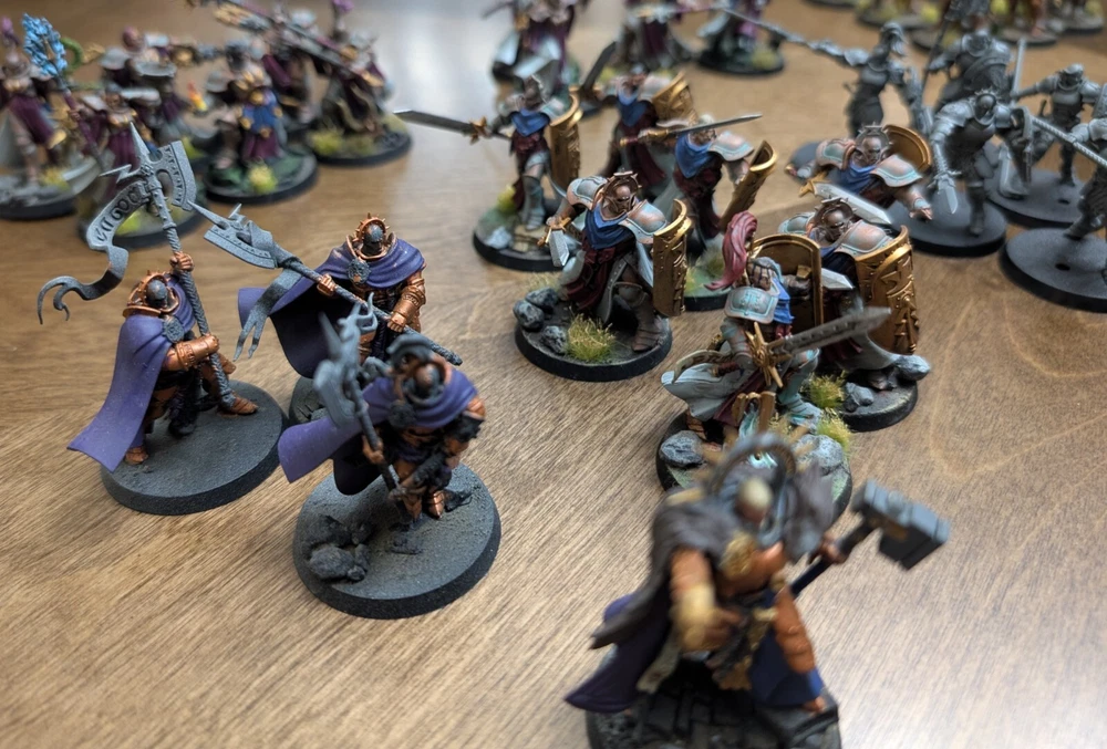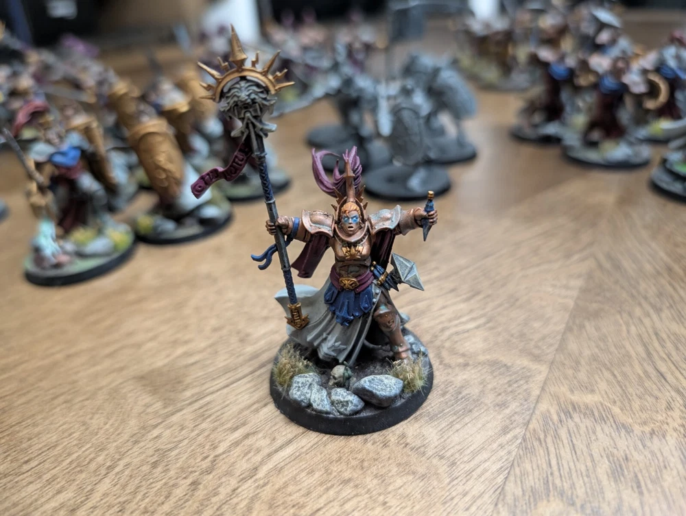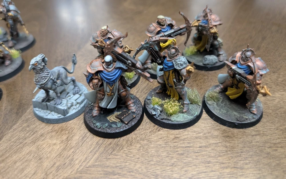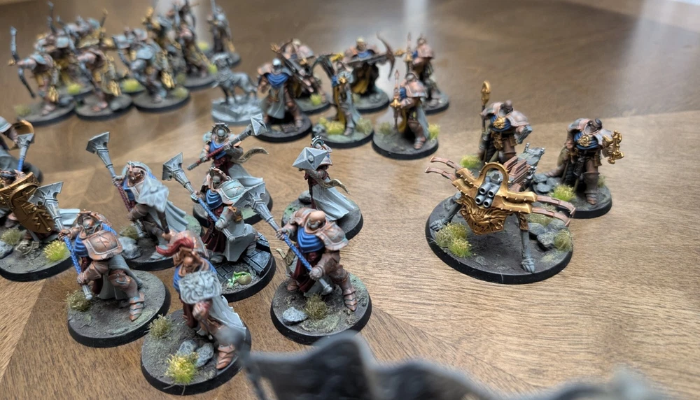 Dive into the fantastical world of Warhammer Fantasy Battle with this Stormcast Eternals army lot, a must-have for enthusiasts and collectors alike. Mostly painted and ready to display, these miniatures showcase the intricate detail and vivid colors that Games Workshop is renowned for. Perfect for both seasoned gamers and newcomers to the Age of Sigmar version, these figures are poised to bring the mighty battles of Warhammer to life. The mixed lot includes a variety of Stormcast Eternals, reflecting the diverse and powerful aesthetic of this iconic Warhammer faction. With some painting, this set offers a canvas for personal touch and a stepping stone for those looking to enhance their gaming experience. Enhance your collection and conquer the battlefield with these storied figures. Just over 2200 points of models. 1x Lord Arcanum on Gryph Charger 1x Lord Important 1x Lord Ordinator 1x Knight Incantor 1x Knight Vexillor w/ Banner of Apotheosis 2x Squads of Sequitors 1x Squad of Liberators 1x Squad of Vindicators 2x Squads of Castigators 2x Squads of Evocators 1x Squad of Praetors 2x Squads of Vigilors 1x Celestar Ballista Also throwing in a spare Annihilator model.