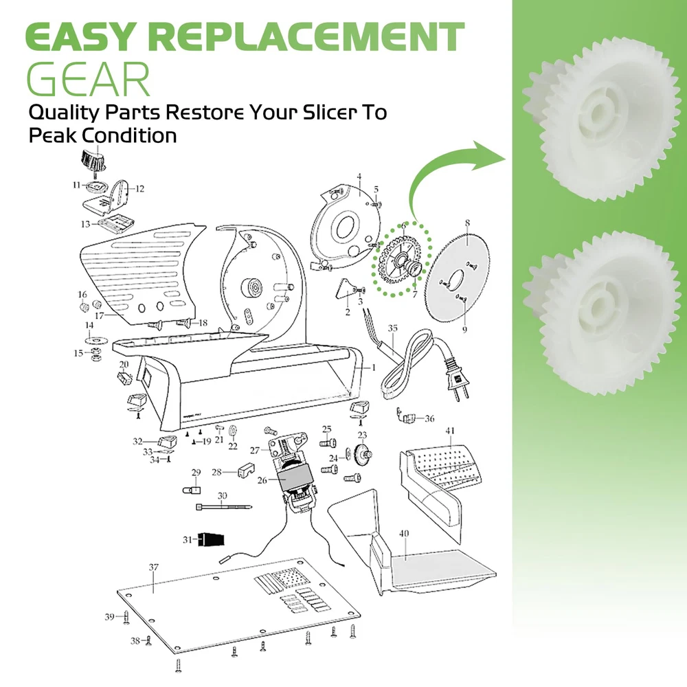 Pokin food slicer motor gear fit for Waring Professional food slicer Food Slicer Motor Gear The newly upgraded design is designed for a precise fit and optimal performance in Waring FS150 and FS155 food slicers Item specifics Type: motor gear Material: Plastic Model number: 026599 Food Slicer Models: FS150 FS155 26599 Package included: 2 pack gears EASY REPLACEMENT GEAR Transfers are easy to install It fits perfectly into place Smooth to use when replacing with new ones Quality Parts Restore Your Slicer To Peak Condition Meat Slicer Parts: Package of 2 motor gears, Food slicer motor gear compatible with Waring Professional food slicer models FS150 FS-150 FS155, Replace part number 026599,26599. Premium Quality: Food slicer motor gear, Made of high-quality materials, Designed for precise fit and optimal performance in Waring FS150 and FS155 food slicers Easy to install: Motor gears before installation, Please remove/install screws with a Phillips screwdriver. Quality parts restore your slicer to peak condition Motor Gear Function: Newly upgraded food slicer motor gear, Durable construction ensures long-lasting use and reliable operation, Maintaining the efficiency and consistency of your Waring food slicer 【AFTER-SALE SUPPORT】If you have any questions or concerns about our food meat slicer motor gear replacement parts, please do not hesitate to contact us. We will do our best to provide you with a satisfactory shopping experience.