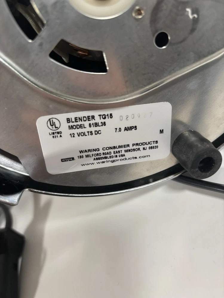 The Waring Pro Tailgater Blender TG15 Model 51BL36 is a portable blender with a 48oz capacity, ideal for making frozen drinks, smoothies, and blending vegetables. It operates on 12V power and features a single speed setting, an ice crusher, and non-slip feet. The chrome finish and metal material give it a sleek look, while the multi-purpose blade ensures easy blending. This blender is designed for on-the-go use and was assembled in the United States. SKU5
