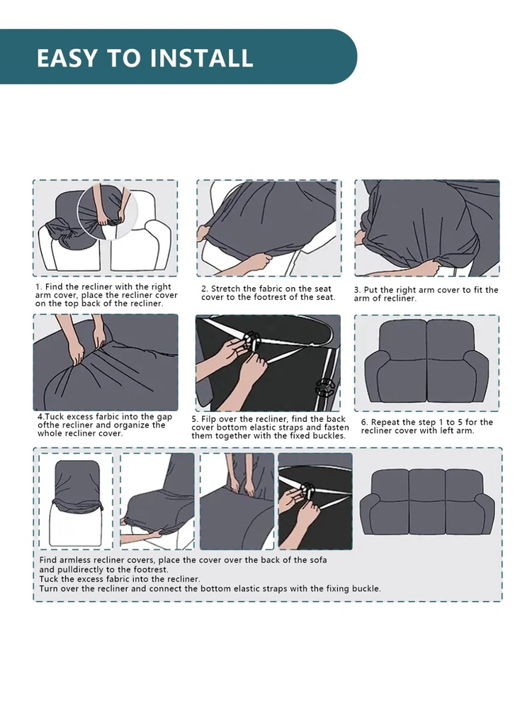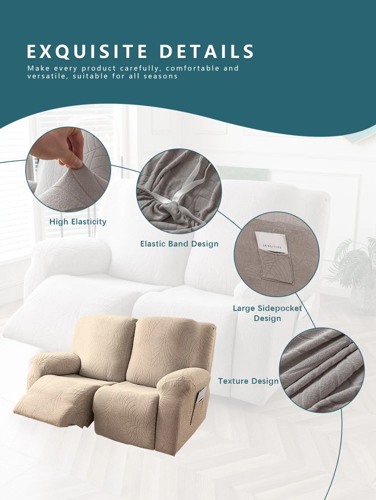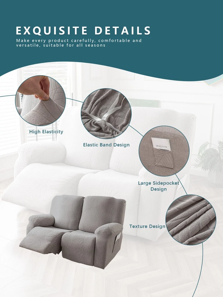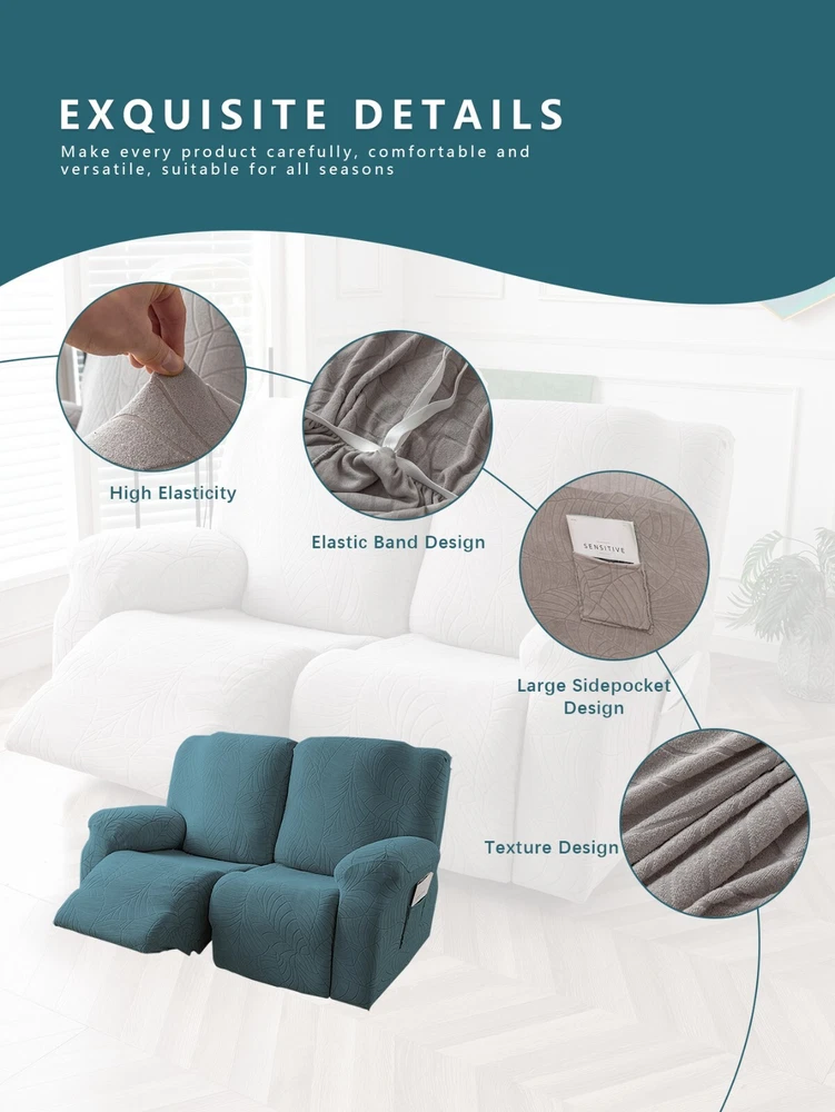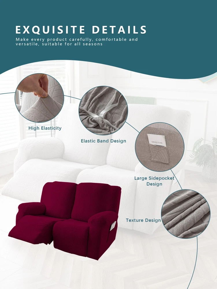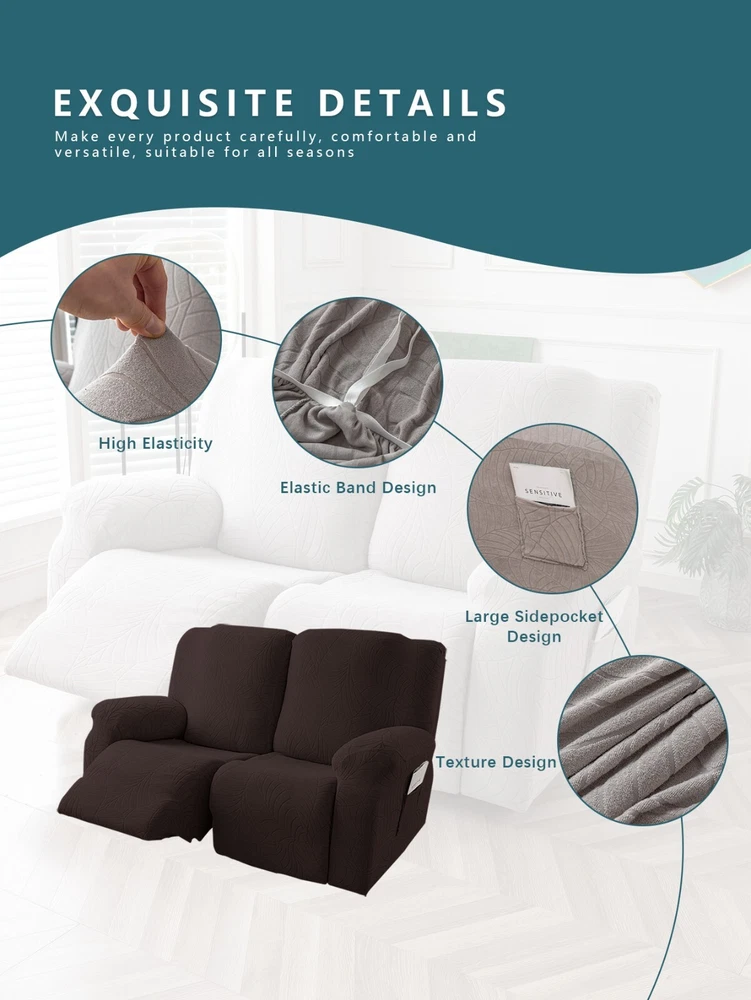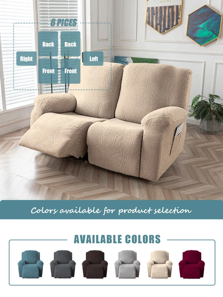 Great Quality Material: Recliner cover made of 88% polyester and 12% spandex jacquard fabric. The fabric is thick, highly elastic, and soft to the touch, providing excellent protection against stains, spills, scratches, and tears. The recliner chair couch cover gives your recliner sofa a luxurious and elegant new look. Fit Size:The slipcover has extra stretch that makes it suitable for most two-seater recliners, including regular recliners and those with consoles. The recliner slipcovers fits recliner that measure 48”-65” inches(center console not included). It's essential to follow the measurement guide details to confirm the size before purchasing. Easy to Install:This recliner cover is easy to install with the user manual provided. With its different colors, it's a quick and easy way to update the color or fabric of your existing furniture, making it a great and affordable way to redecorate on a budget. It's perfect for families with kids, pets, or worn-out couches. Thoughtful Design:The loveseat recliner cover is designed thoughtfully with two reclining chair covers and one center console cover, which can be purchased separately for convenient free combination. The cover stays in place with a bottom elastic strap, ensuring it doesn't move around. The pocket design on one side is also handy for placing your remote control, glasses, or any small items for easy access. Easy Care:This cover is easy to care for, protecting your furniture from accidental dirt such as water or dust. It maintains its fresh look after multiple washes and can be washed by hand or machine. The washing temperature is about 30 degrees Celsius, and mild detergent is recommended. It's important not to bleach or iron the cover.