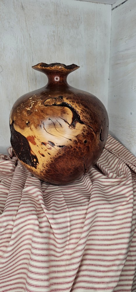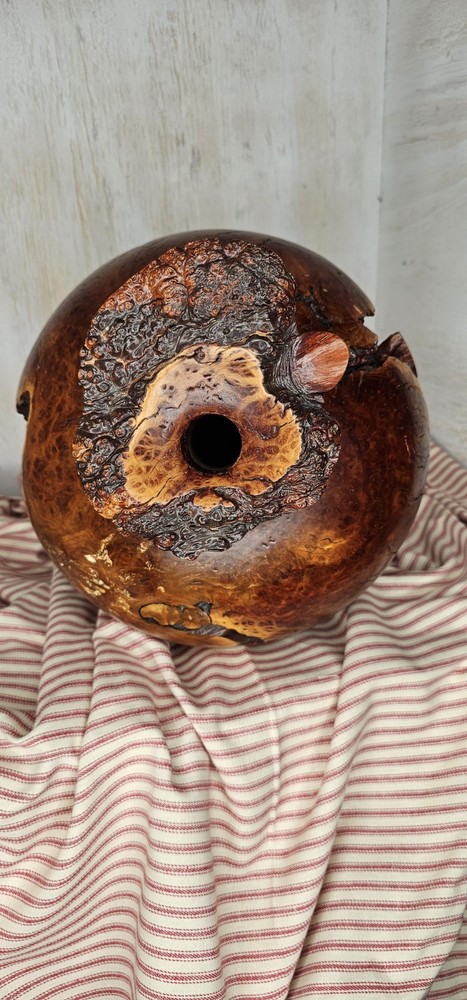 Warren Vienneau Manzanita Burl Wood Vase 11 inch tall 10 inch round signed by artist on bottom One of a kind has very cool voids cracks and holes all occurring naturally from the growth of the tree! The top is unusual as it's not symmetrically turned it's a natural shape oblong with a 3/4 inch approximately hole in center!