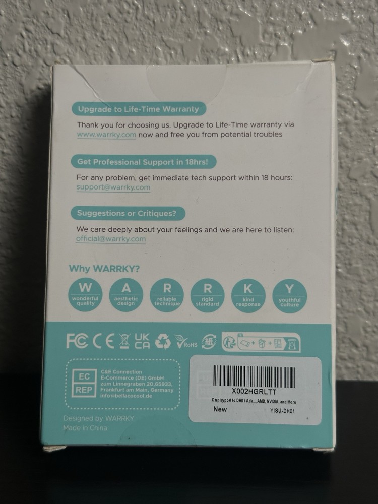 Produktart:Does not applyBrand:WARRKYCountry of Origin:ChinaItem model number:WARRKY-AV-DH01Specific Uses For Product:Monitor,ProjectorPackage Dimensions:4.72 x 3.46 x 0.75 inchesFinish Type:Hdmi,ProjectorCable Length:10 inConnector A:DisplayPortFeatures:Gold PlatedItem Weight:1.41 ouncesCompatible Devices:Laptop, PC, Virtual Reality HeadsetConnector Gender:Male-to-FemaleItem Package Quantity:1Color:Silver GreyNumber of Ports:2Marke:Does not applyConnector Type:DisplayPort to HDMIManufacturer:WARRKYType:HDMI AdapterUnit Count:1.0 Count