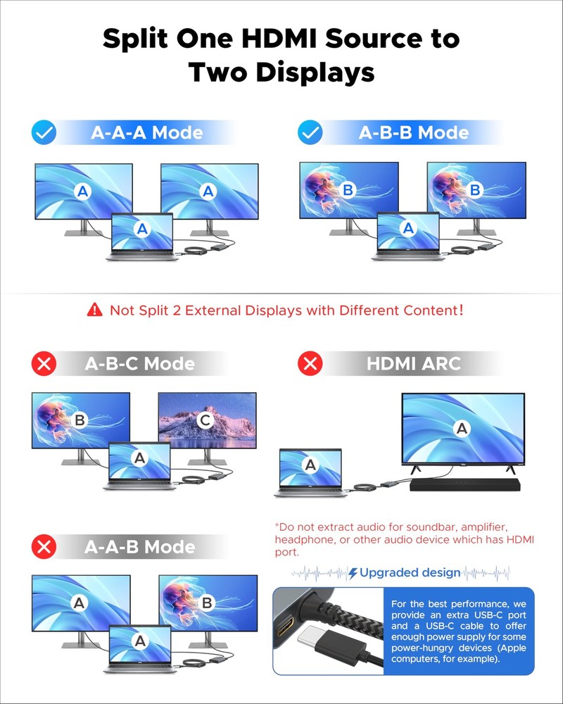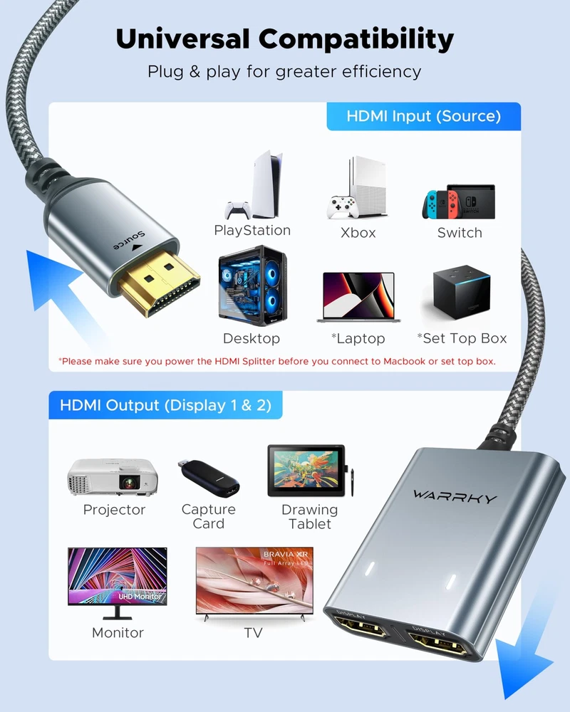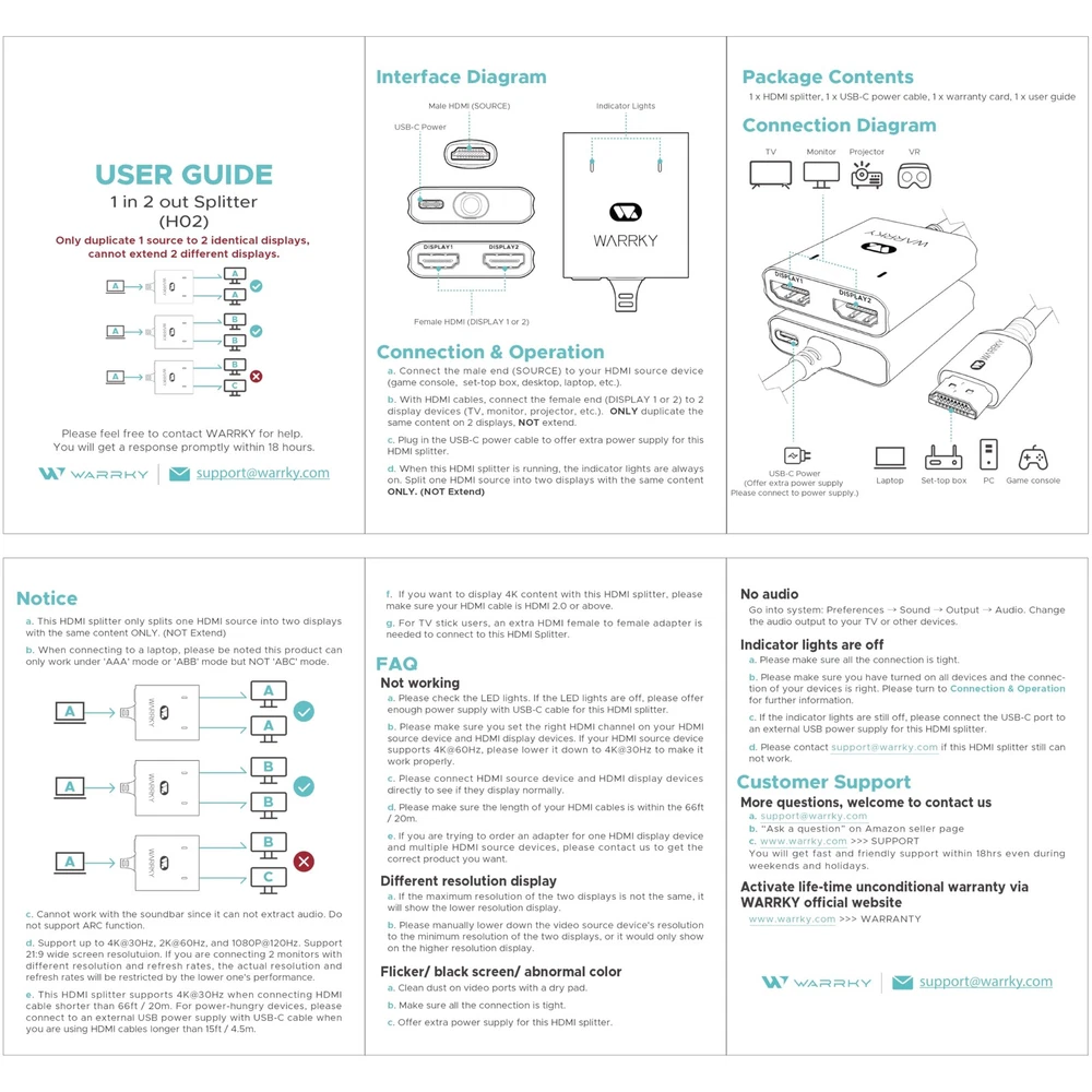 (ONLY MIRROR the same content on 2 displays, NOT EXTEND different content on 2 monitors for computer) Package includes: 1 x 4K HDMI Splitter, 1 x USB-C power cable, and 1 x User Guide. [HDMI Splitter 1 in 2 out] Please be noted that this HDMI Splitter does not support extend mode, only support mirror mode. Duplicate 4K HDMI signals from a single source to two HDMI displays, with synchronized video and audio. Ideal for enjoying TV shows in different rooms using only one TV box or more dual-screen setups! (Mirror/Duplicate mode only.) [USB-C Powered for Stable Performance] This HDMI amplifier splitter supports up to 66ft HDMI cable, significantly outperforming the average standard. The included USB-C power cable can be connected to any USB-A device to provide stable performance for Apple products, PS4, or TV boxes. No need for a separate charger. Compact size: 2.1 x 1.8 x 0.5 inches (L x W x H). Weight: 3.8 oz. NOTE: Please power the HDMI Splitter before connecting other HDMI devices. [Mirror the Same 4K Contents to 2 Screens] This HDMI duplicator support up to UHD 4K@30Hz, QHD 2K@60Hz and FHD 1080P@120Hz. Backward compatible with 480i@60Hz/480p@60Hz/576i@50Hz/576p@50Hz/720p@60Hz/1080i@60Hz/1080p@60Hz. Compliant with HDCP 1.4. Support audio format: DTS-HD/Dobly-true HD/LPCM7.1/DTS/Dobly-AC3/DSD/HD(HBR). ONLY support 4K@60Hz in YCbCr. NOT support CEC, HDR, and VRR. [Full Metal Casing for Durability] Both ends are covered by aluminum alloy case. Hard to break. Gold-plated HDMI male and female connectors maximize conductivity. Nylon braided cable, never rupture. Ergonomic curve design, easier to grip. Comes with a 3.3ft HDMI Cable, which save you an extra one. [What's in the Package?] Inside the package, you'll find a 4K HDMI Splitter, a USB-C power cable, and a user guide. All WARRKY products are backed by online support team. If you have any questions regarding this dual hdmi adapter, please consult for fast and responsible support within 18hrs!