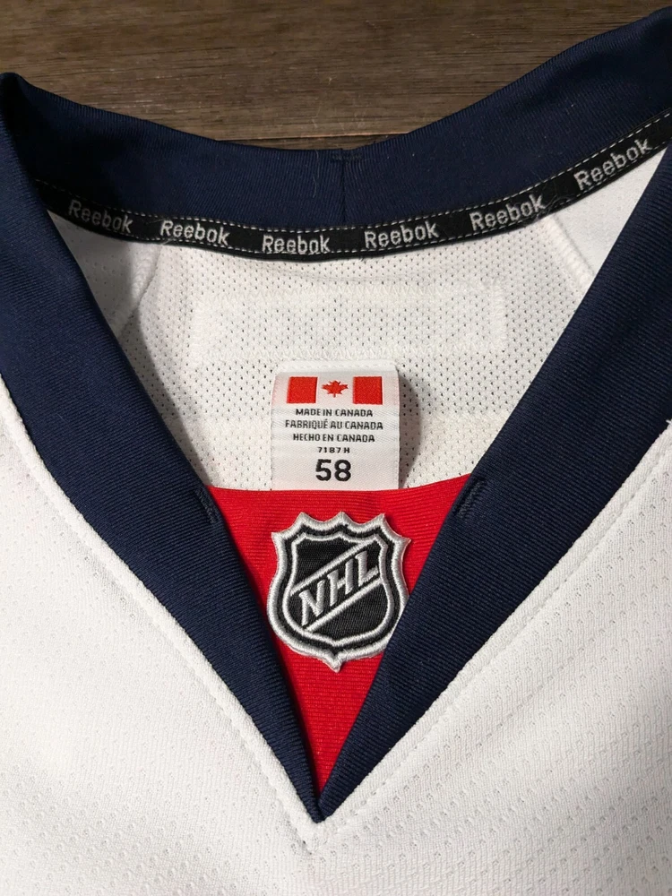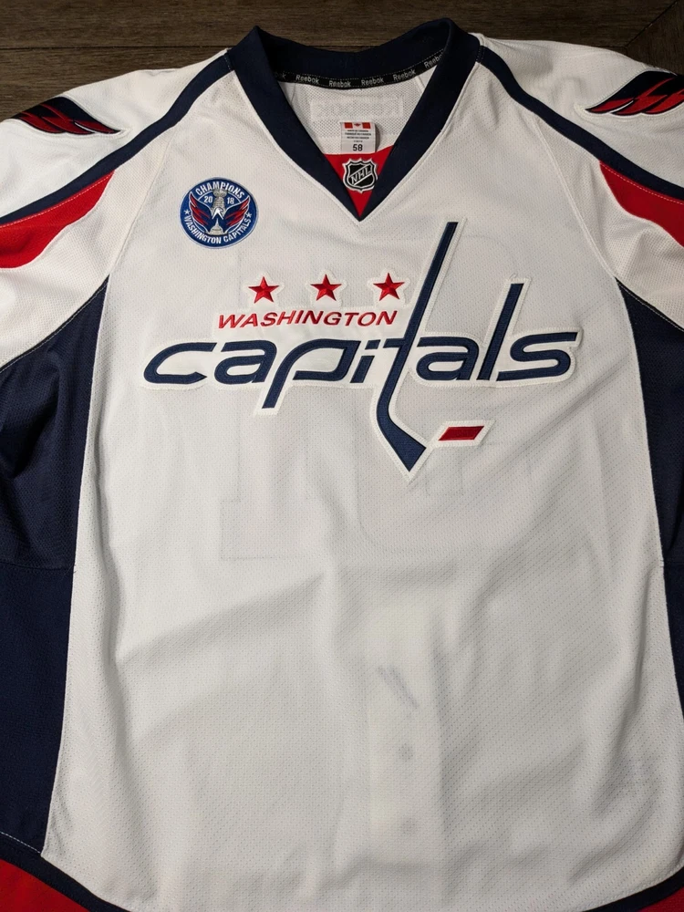 White on ice and game used Capitals jersey in great shape. Size tagged 58 but I feel it's more like a 56. Reebok brand gamer would make a great addition to your collection. Message me with any questions you might have or make an offer. Ships immediately. Thanks for looking.