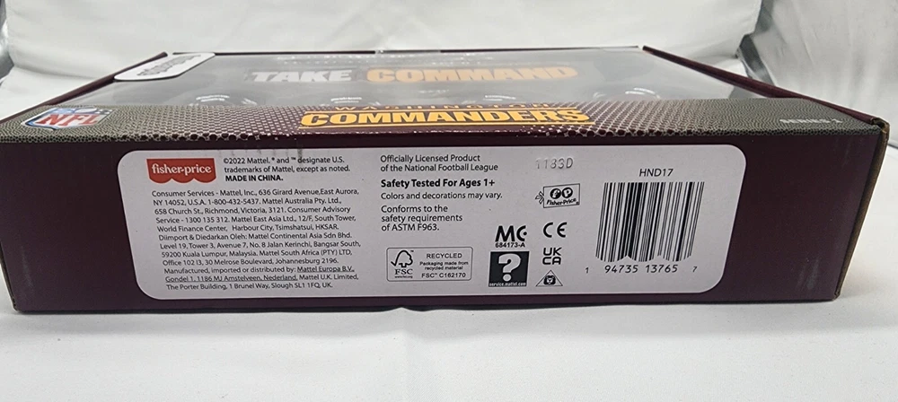 ***Check out my other listings for other collectors items!*** Model # HND17 NFL officially licensed. New, sealed in box. Free shipping! Ships same day when ordered before 6pm EST. This is a must-have for any NFL fan! The Washington Commanders Little People Collector NFL Fisher-Price toy is perfect for children aged 3 and above. It features the beloved Little People characters and is made by Fisher-Price, a trusted brand in the toy industry. The toy is made in China and is part of the 2023 line of Little People toys. This toy is perfect for collectors and fans alike! The Commanders are one of the most popular NFL teams, and this toy is sure to bring a smile to anyone's face. The recommended age range is 3+, making it a great gift for young children. Get yours today and add it to your collecti
