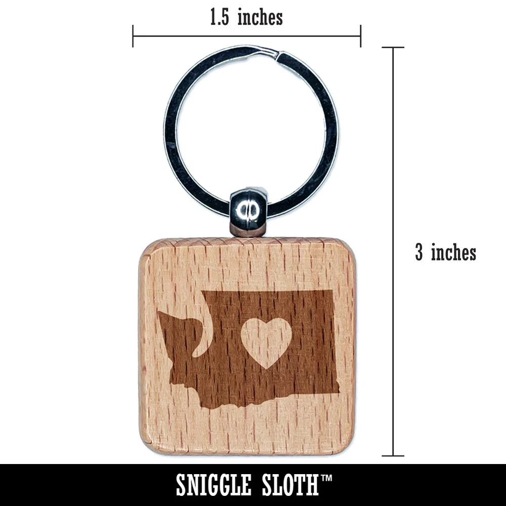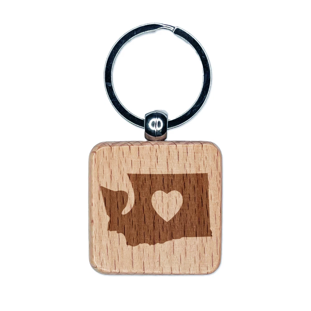 Washington State with Heart Engraved Wood Square Keychain Tag Charm
