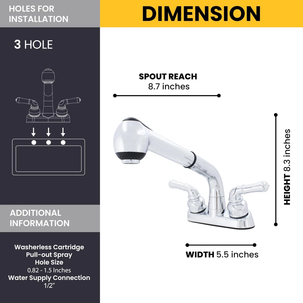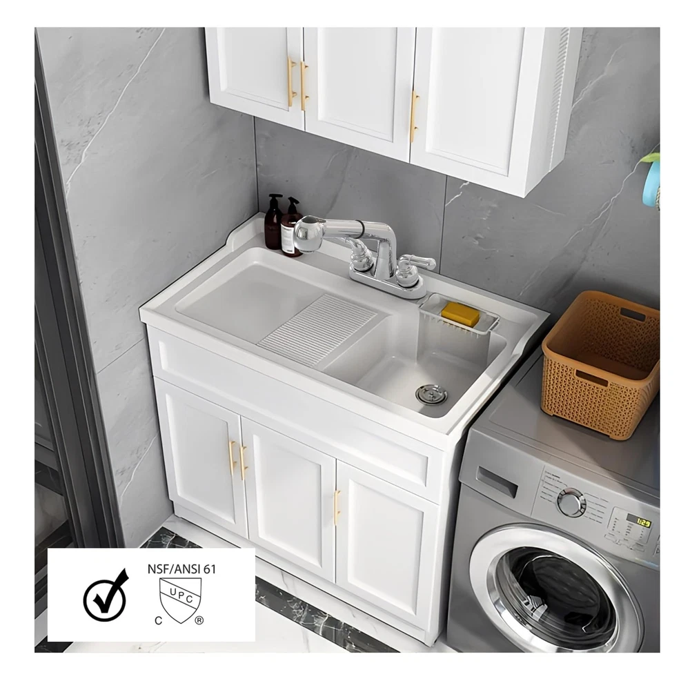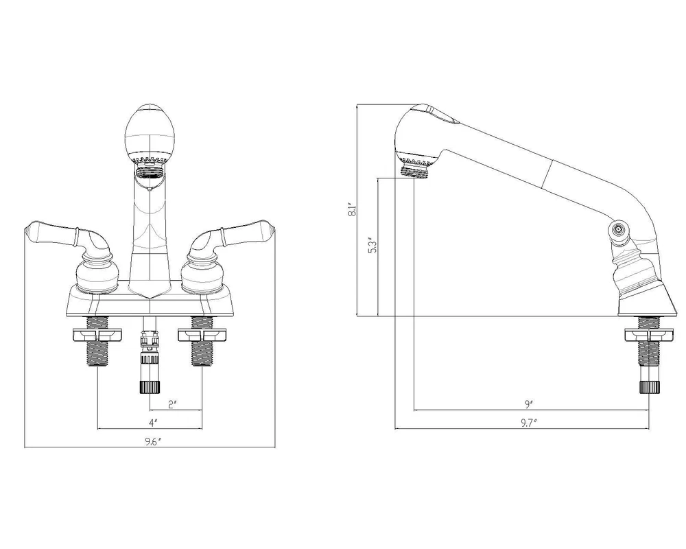 Meet the Wasserman Two-Handle Pull-Out Utility Faucet, a versatile and practical addition designed to simplify your daily tasks in laundry rooms, mudrooms, and garages. With double handles that adhere to ADA compliance standards, this utility faucet offers easy control, making it accessible to users of all abilities. The pull-out feature is a game-changer, allowing you to extend the faucet head for maximum reach, making washing and cleaning a breeze. Installation is straightforward, and tailored for a 3-hole, 4-inch on-center setup, ensuring a secure and reliable connection. The 1/2 in. male thread shanks provide durability and resilience against wear and tear. A durable washerless cartridge guarantees that you won't have to worry about leaks or drips, ensuring consistent operation over time. The faucet's full swivel pull-out feature further enhances its versatility,. esigned to meet ADA compliance and constructed from non-metallic materials, this utility faucet is an ideal choice for laundry rooms, mudrooms, and garages. Its non-metallic construction ensures durability while resisting corrosion, making it a perfect fit for spaces where water exposure is frequent. Our Non-Metallic Double Handle Pull-Out Utility Faucet with Washerless Cartridge is your go-to solution for efficient and convenient water access in utility areas. Designed for laundry/mudrooms and garage sink Pull out head features handle and dual spray function Limited Double handle utility faucet, ADA compliant for easy control Pull out to make washing and cleaning a breeze Holes for installation:3 hole, 4 in. on center 1/2 male thread shanks Durable washerless cartridge Full swivel pull out for maximum reach