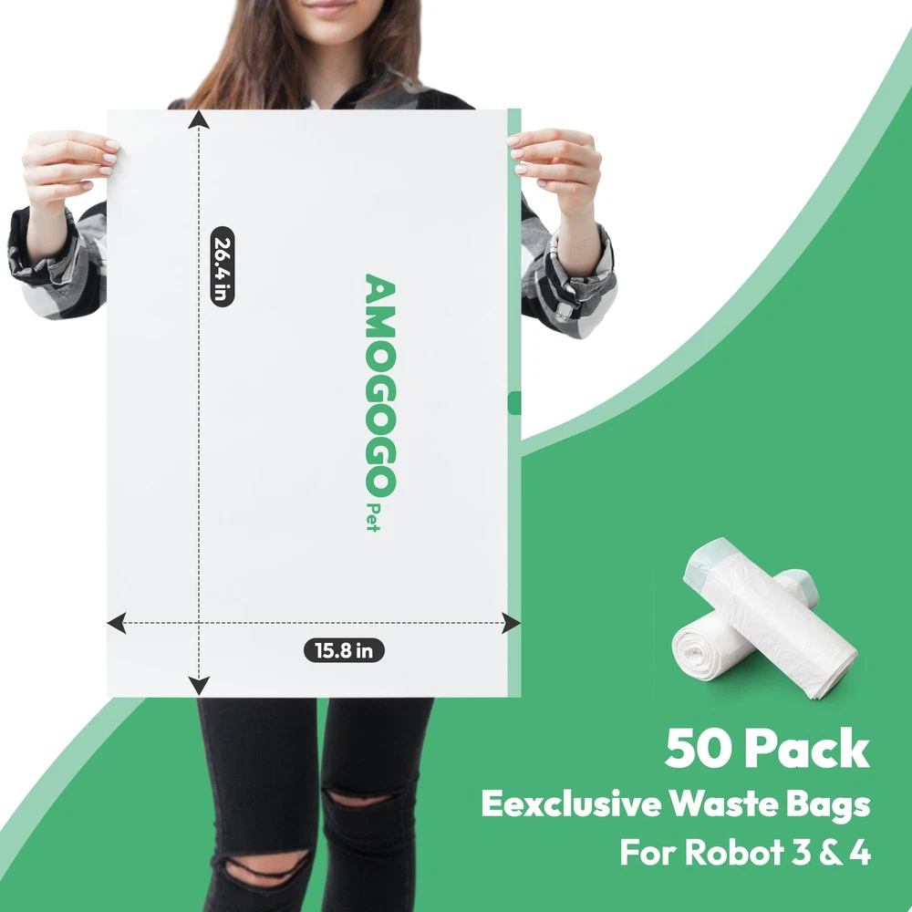 Compatible with Robot Model 4 & 3 self-cleaning litter boxes (confirm model before purchase). Each 26.4"x15.8" (67x40cm) bag supports up to 22 lbs, fitting 9-11-gallon drawers. This 50-pack of unscented, heavy-duty liners features leak-proof reinforced seals and tear-resistant materials to contain odors and withstand daily use. Pre-separated rolls ensure easy, space-saving storage and frustration-free setup: fold edges over Robot 4 drawers or tuck rolled edges into Robot 3’s tabs. The thick drawstring closure enables quick, knot-free disposal—simply pull to seal waste securely. Crafted for effortless maintenance, these waterproof bags keep your litter system hygienic while simplifying cleanup. Note: Litter box not included; images shown for compatibility reference only. Confirm product details to ensure proper fit. Compatible with Robot 4 and 3: Specifically designed to seamlessly compatible with Robot 4 and 3, these waste bags ensure a seamless match. Upgraded drawstring design for easy disposal Large Sturdy Thick Litter Liners: Each liner can hold 9 to 11 gallons, measuring 26.4 x 15.8 inches, with a maximum load capacity of 22 lbs. With durability, leak-proof, tear-resistant, and corrosion-resistant properties, they are ideal for use as waste bags in self-cleaning cat litter boxes Pre-separated & Rolls: Every waste bag comes pre-separated, so no tearing apart is needed, making cleanup a breeze. Packed in rolls, they're easy to store, saving space. Ideal for any home, these litter bags combine simplicity and efficiency in one tidy package Generous Quantity: Each package contains 50 unscented litter box liner bags, providing a six-month supply for your automatic cat litter box. No more frequent purchases needed Opaque Waste Bags with Drawstring: Our bags feature a sturdy built-in drawstring to prevent waste exposure and odor leakage. Swiftly tighten the drawstring to remove the litter bag, keeping your hands clean throughout the process. The opaque white design hides waste from view during disposal, making cleaning more pleasant Customer Service: Any defective litter box bag, please message us without hesitation, and we will offer you a suitable solution in 24 hours Note: This package only includes litter bags, not a automatic cat litter box. The litter box shown in the images is for illustration purposes only to demonstrate the compatibility with the bags. Please confirm the product details before placing your order