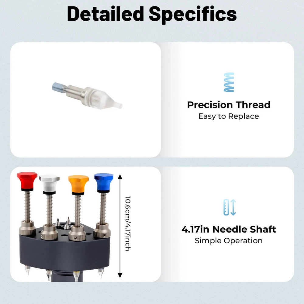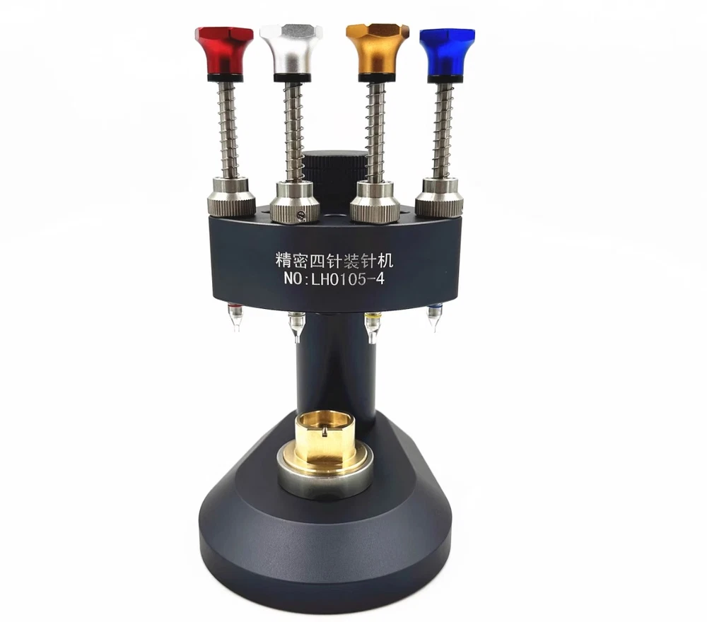 Watch Movement Pinning Machine for Four-Hand Movements Pin Pressing Tool Color: Black Grey Material: Metal, Steel, Acrylic Process: Oxidation, Sanding Style: Modern Mounting Type: Tabletop Mount Assembly Required: No Needle Tips Aperture: 0.6mm/0.024in+1.2mm/0.047in+1.6mm/0.063in+Solid Movement Bases Specification: 2035, 2824/2892, 3135 Number of Steel Needle Tips: 4 Number of Acrylic Needle Tips: 4 Number of Movement Bases: 3 Needle Shaft Length: 10.6cm/4.17in Product Size: 13.5*9.5*18cm/5.31*3.74*7.09in Package Size: 15*15*25cm /5.91*5.91*9.84in Gross Weight: 1.98 kg /4.37lbs Net Weight: 1.4kg/3.09lbs