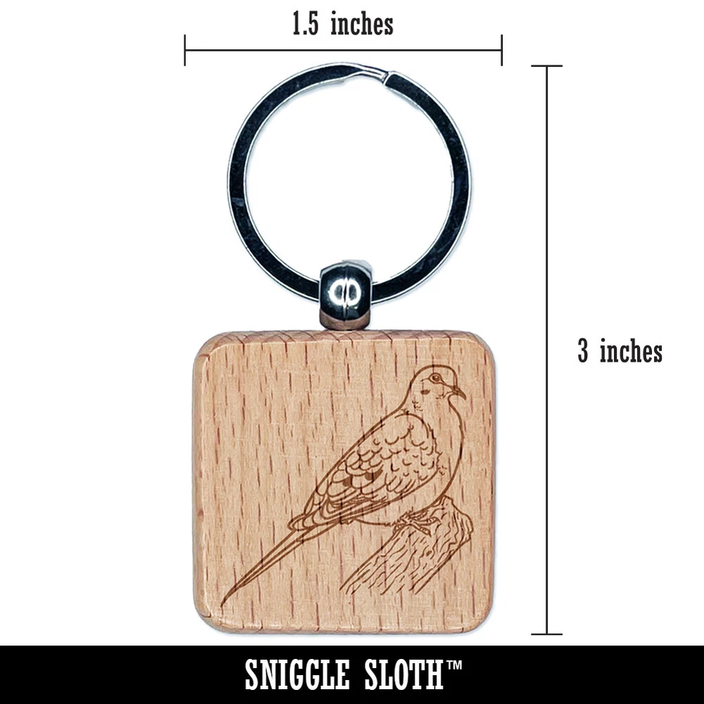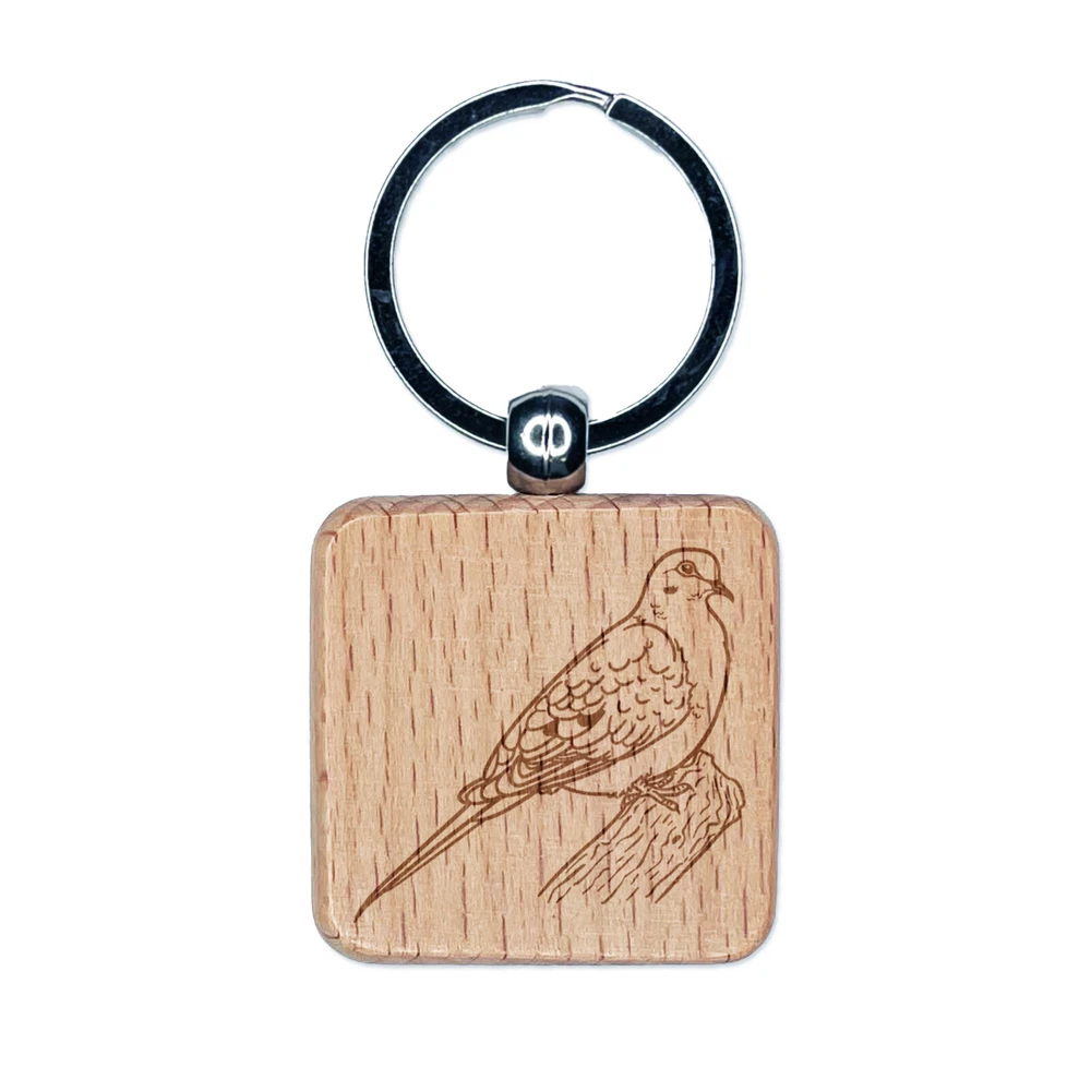 Watchful Mourning Dove Bird Engraved Wood Square Keychain Tag Charm