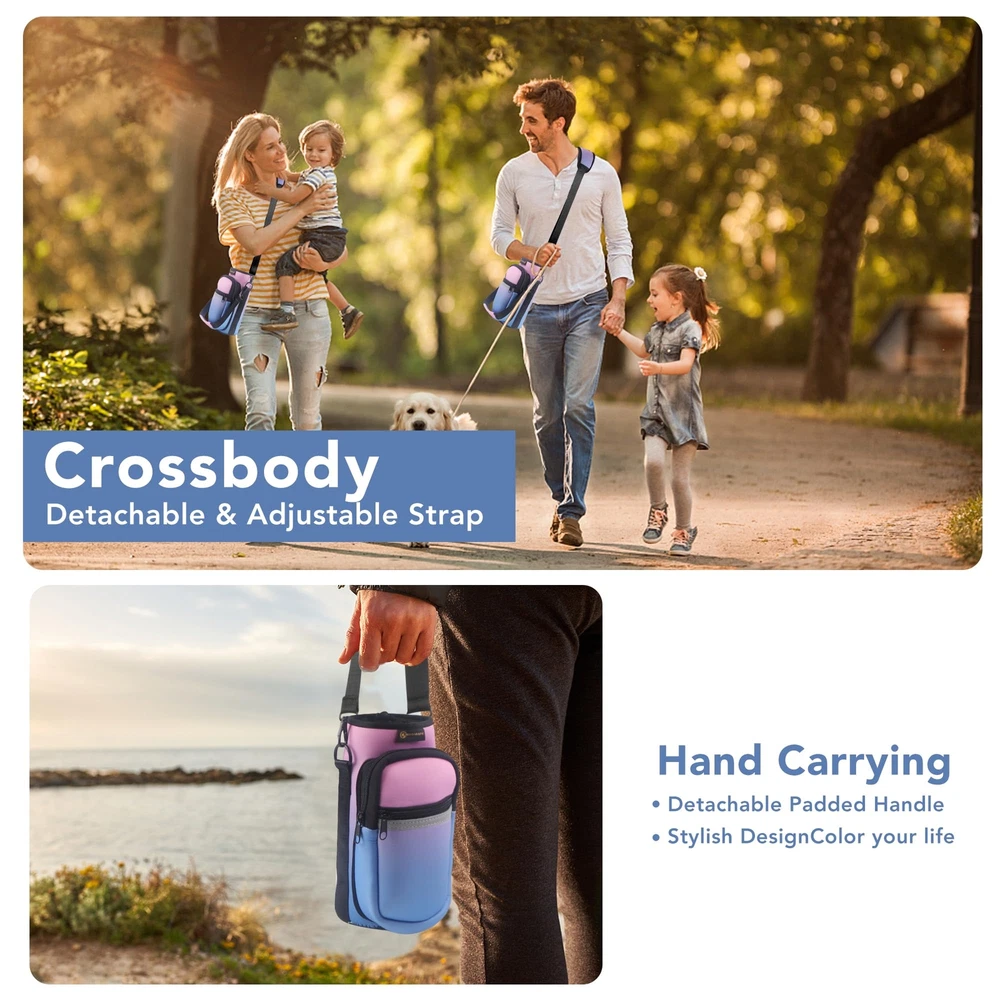 Premium Material: water bottle carrier bag is made of high quality neoprene material that protects your water bottle from scratches and scrapes, while keeping it highly soft and flexible, water resistant and durable Convenient to Carry: Our water bottle carrier bag comes with adjustable shoulder straps and a handle strap, making it easy for you to carry your water bottle with you wherever you go and making your travels more effortless Multi-Functional Design: This water bottle bag not only holds your water bottle but also has two additional pockets for storing your phone, wallet, keys, and other items, making your travels more convenient Suitable for All Occasions: Whether it's for outdoor sports, travel, hiking, or daily use, our water bottle carrier bag is an ideal choice Safety Assurance: We provide high-quality water bottle carrier bags, and if you encounter any issues during use, we will be dedicated to serving you and ensuring your shopping experience is worry-free