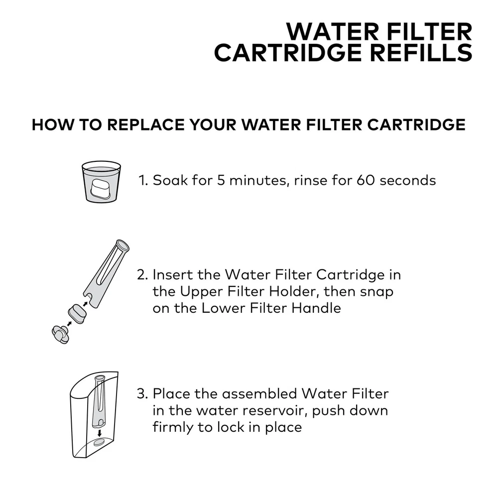 Great-tasting beverages start with great-tasting water. Keep your water fresh and your beverages tasting their best with Water Filter Cartridges. Designed to be used in conjunction with the Water Filter Handle, these cartridges form an easy-to-use filtration unit that fits inside the water reservoir of your coffee maker and helps remove chlorine and other impurities from your water, so your coffee, tea, hot cocoa, or any one of hundreds of delicious K-Cup varieties tastes exactly as it should. Water Filter Cartridges are designed for use with all Water Filter Handles, and are compatible with nearly all coffee makers. To keep your beverages at the peak of their flavor, we recommend that you change your Water Filter Cartridge every 2 months or 60 tank refills, whichever comes first. Like all accessories, these cartridges are BPA-free and made from the highest quality materials. Great tasting beverages start with great tasting water Includes 6 water filter cartridges (12 month supply) Water filters help remove chlorine from your water and should be changed every 2 months, or 60 tank refills For use with all water filter handles Bpa free and made from the highest quality materials