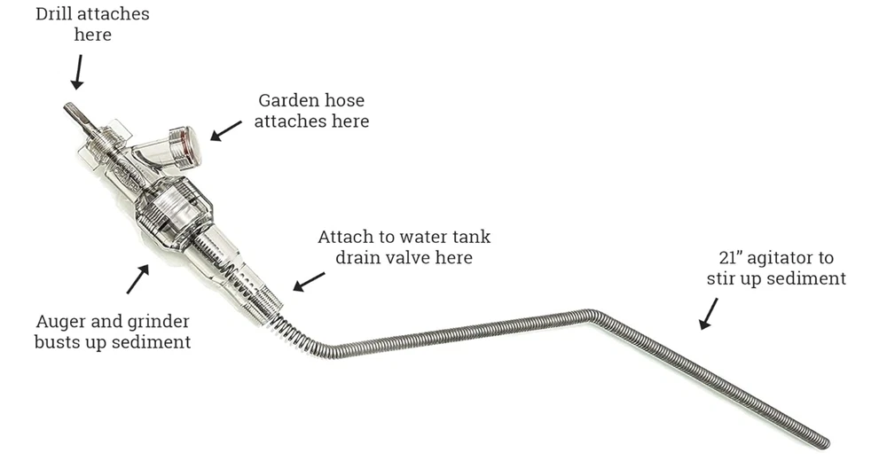 Water Heater Cleaning Tool, Improves Hot Water Supply, Removes Hard Water Sediment, Flushes Gas & Electric Tanks, Pro-Grade DIY Solution MULTIPLE BENEFITS – Extend the lifetime of your water heater, improve its efficiency, reduce your energy bill, and increase your hot water supply. This tool pays for itself in one use! WORKS GREAT – Other flushing methods only remove small loose sediment particles where the Turbo Tank Cleaner physically breaks up the large sediment deposits collected at the bottom of the tank. UNIVERSAL – Cleans all water heater tank types, gas and electric (not for tankless water heaters). CLEAR HOUSING – This allows for full visibility during the sediment removal process. QUICK AND EASY – Install through the tank's drain valve hole, no need to drain the tank, and works with any cordless drill and standard garden hose. DURABLE – Several iterations have been made to improve the ruggedness of the tool. This includes upgrading the housing to an impact resistant polycarbonate plastic (1/28/2023). ENGINEERED FOR PROTECTION – Features a lightweight, smooth spring agitator designed to shield the water heater's essential parts. Effective at low drill speeds, ensuring the dipping tube, heating elements, and tank lining remain unharmed.