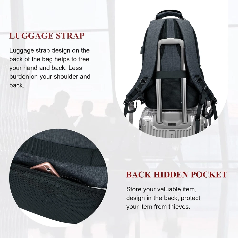 Material: Made of Water Resistant and nylon fabric with polyester lining; Silver metal zipper. This is a lightweight professional office work bag. Ensure a long-lasting usage everyday. Large Capacity and Well Organized: A lost of storage space and pockets. This backpack has 2 main compartment, 2 front zip pocket and back anti theft pocket. 2 elastic mesh side pockets. A 17 inch laptop compartment and an 11-inch ipad compartment. Thicken the sponge to prevent damage to electronic equipment. Internal with multi pockets, pen pockets, zipper mesh pocket, open pocket, key fob hook, power bank pocket. Make your items organized and easier to find. Convenient USB Port and Headphone Port Design: With built in USB charger and headphone port outside and built in charging cable inside, great convenience for charging your electronic items via connecting your own power bank. Offers you a more convenient way to charge your phone and listen music on the go with hands liberate. Please note that this backpack doesn't power itself, usb charging port only offers an easy access to charge. The Back of The Laptop Backpack: There are big functions hidden on the back of the backpack. A luggage strap allows laptop bag fit on luggage. Reduce the load during the journey. A hidden secure pocket on the back keeps your passport, wallet and other valuable items safe and handy. Padded back panels and shoulder straps, ergonomic design offers maximum back support and comfort. Multipurpose and Size: Size of travel laptop backpack: L: 13 x W 9.5 x H 19 inch L: 33 x W 24.1 x H 45.7 cm. Weight: 0.825kg(1.82lb). Suitable for commuting or carry-on, can be easily stored. Good choose for a laptop backpack for men, work backpack, office work bag for men and women. This bag only for adult.