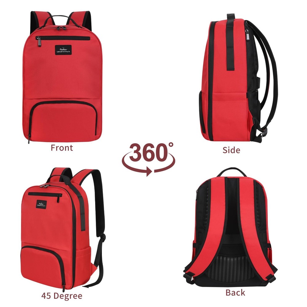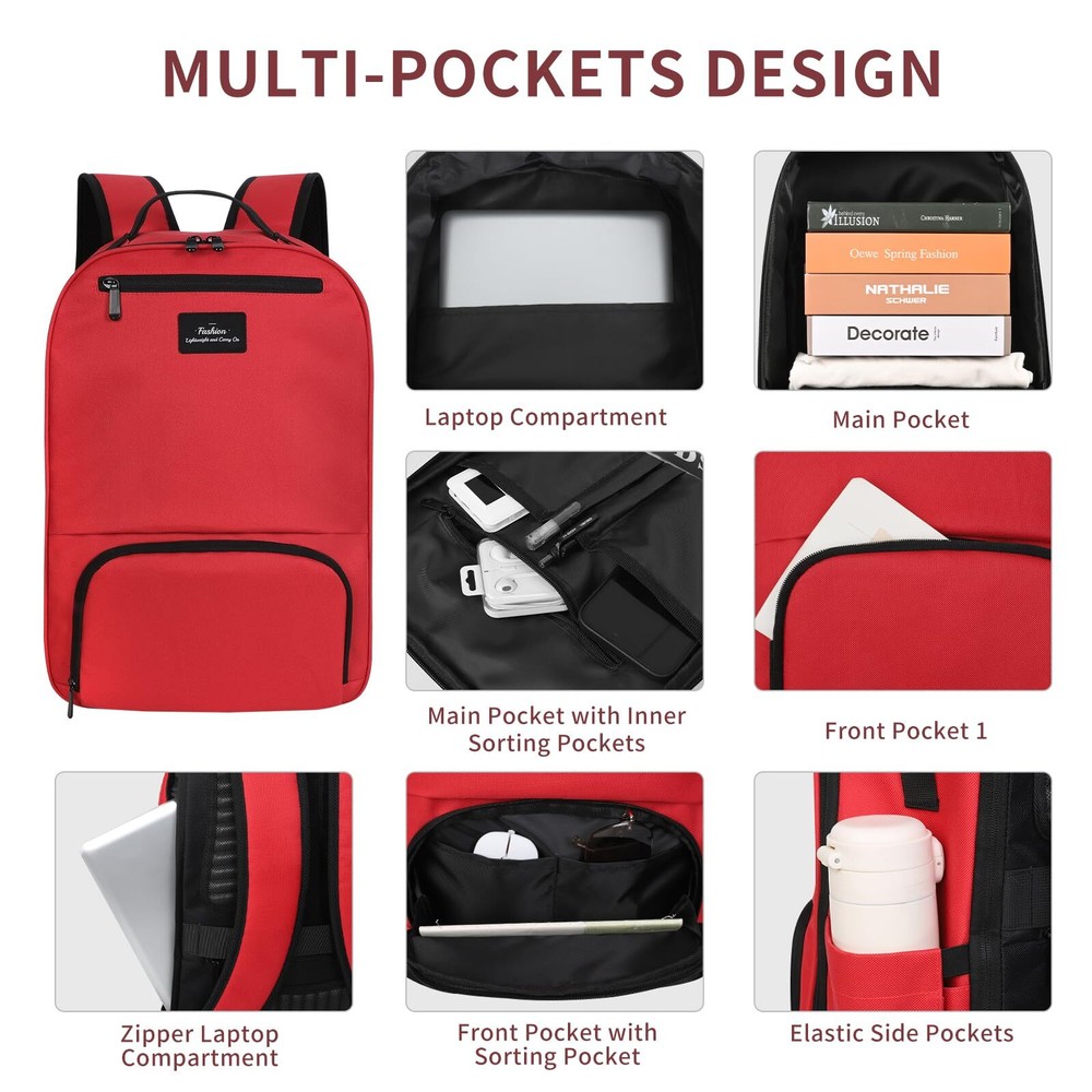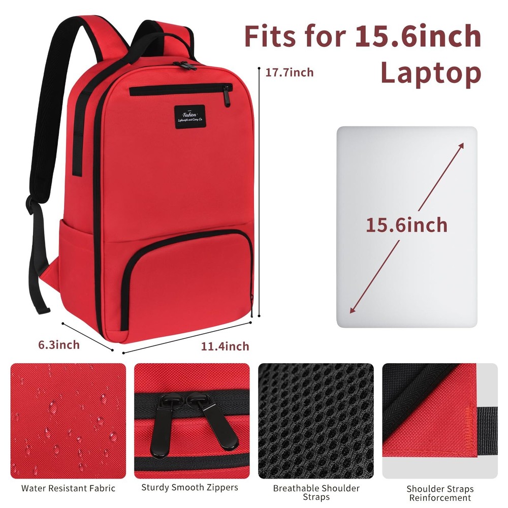 Material & Size: Made of water resistant 300D polyester fabric, wearing-resisting. Adjustable shoulder straps can prevent them from slipping, and make the slim laptop backpack fit your body shape and shoulders better.The backpack SIZE is 17.7*11.4*6.3 inches, easy to organize all personal items and fit up to 15.6" laptops Large Capacity: The separate laptop compartment fits up to a 15.6'' laptop. The large main compartment is roomy for daily necessities, such as A4 folders, magazines, books, tablets, chargers, power bank, and clothes Easy Access: Front zippered pocket of the backpack allows you to put your small items in an organized manner. Backside hidden pocket to keep your phone or other valuable items. Side pockets for water bottles or umbrellas Breathable & Luggage Strap: Mesh padded shoulder straps relieve the pressure on shoulders, providing wear comfort. And the breathable back & heat-dissipating padding makes the whole backpack more comfortable to carry.The back luggage strap of the backpack is easy to transport Widely Using: Its simplistic, stylish look makes it a bookbag, laptop backpack, college backpack, also as a casual travel backpack for travel, work backpack for business. A good present for men and women, boys and girls Washing Instructions: Hand washing or wipe with a damp cloth