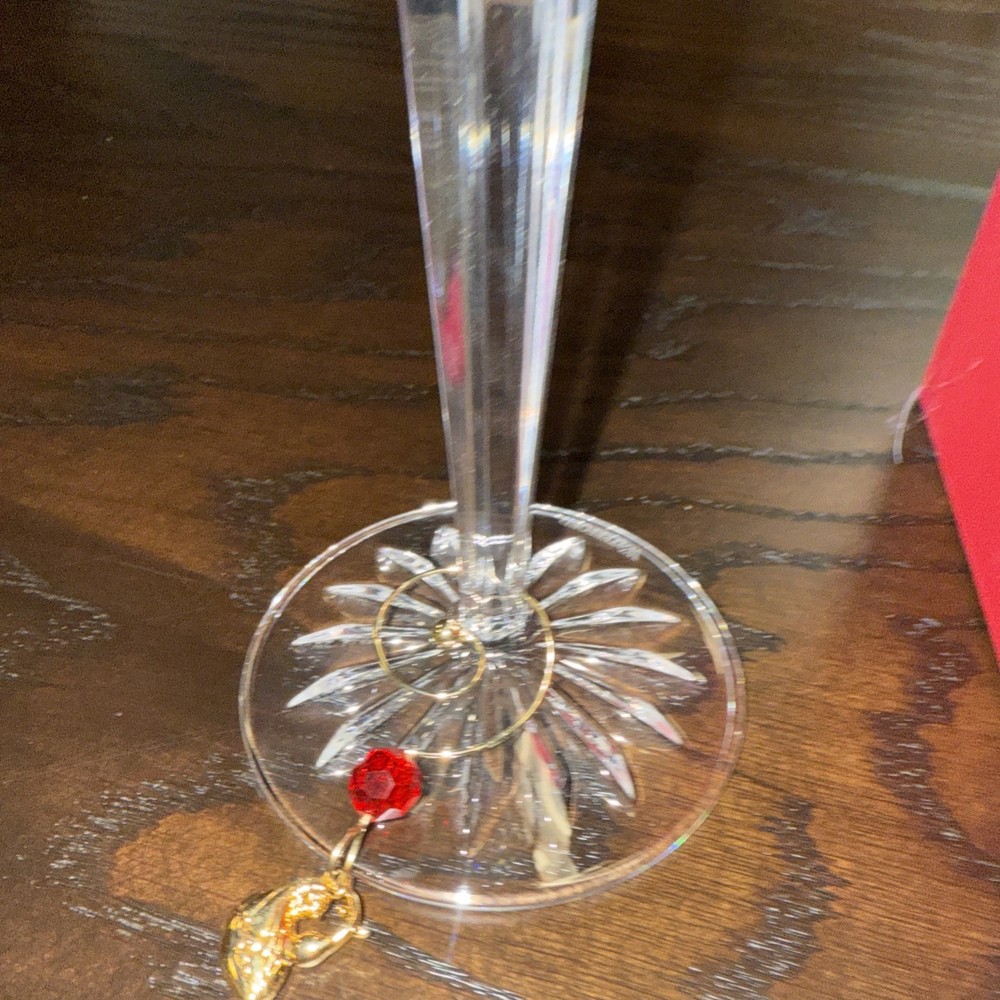 The Waterford 2015 Partridge 12 Days of Christmas Crystal Champagne Flute is a limited edition champagne wine flute glass featuring an etched pattern of a partridge and other holiday-themed details. Made of clear crystal and signed by Waterford, this tapered flute is designed for Christmas occasions and comes in its original presentation box. Manufactured in Ireland between 2000-2009, this collectible piece is a perfect addition to any holiday or Christmas-themed drinkware collection. The box front is stained (see pic) but in otherwise good condition. The glass has not been used and no chips are noted on the flute.